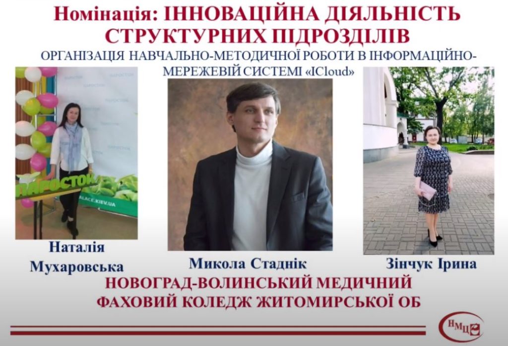 Авторський колектив Новоград-Волинського медичного фахового коледжу (Наталія Мухаровська, Ірина Зінчук та Микола Стаднік) став переможцем в номінації «Інноваційна діяльність структурних підрозділів», представивши методичний посібник «Організація навчально-методичної роботи в інформаційно-мережевій системі «ICIoud».