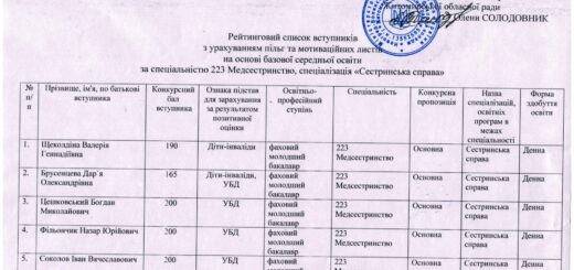 0 Рейтинговий список вступників з урахуванням пільг та мотиваційних листів, на основі базової середньої освіти, за спеціальністю 223 Медсестринство, спеціалізація “Сестринська справа” 17.07.2023