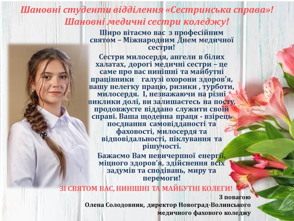 Із безмежною вдячністю медичним сестрам за самовіддану працю ! 12.05.2022 Якщо ви знайшли помилку, будь ласка, виділіть фрагмент тексту та натисніть Ctrl+Enter. Share