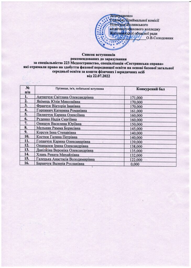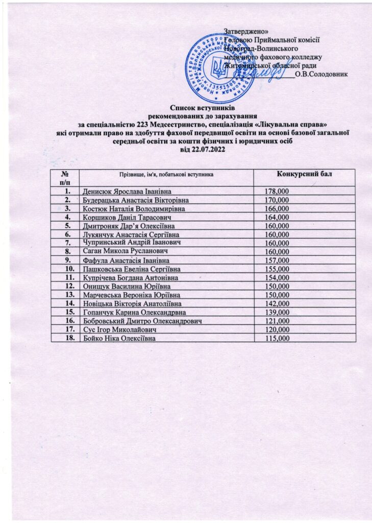 Список вступників рекомендованих до зарахування за спеціальністю 223 Медсестринство “Лікувальна справа” та “Сестринська справа” за кошти фізичних і юридичних осіб