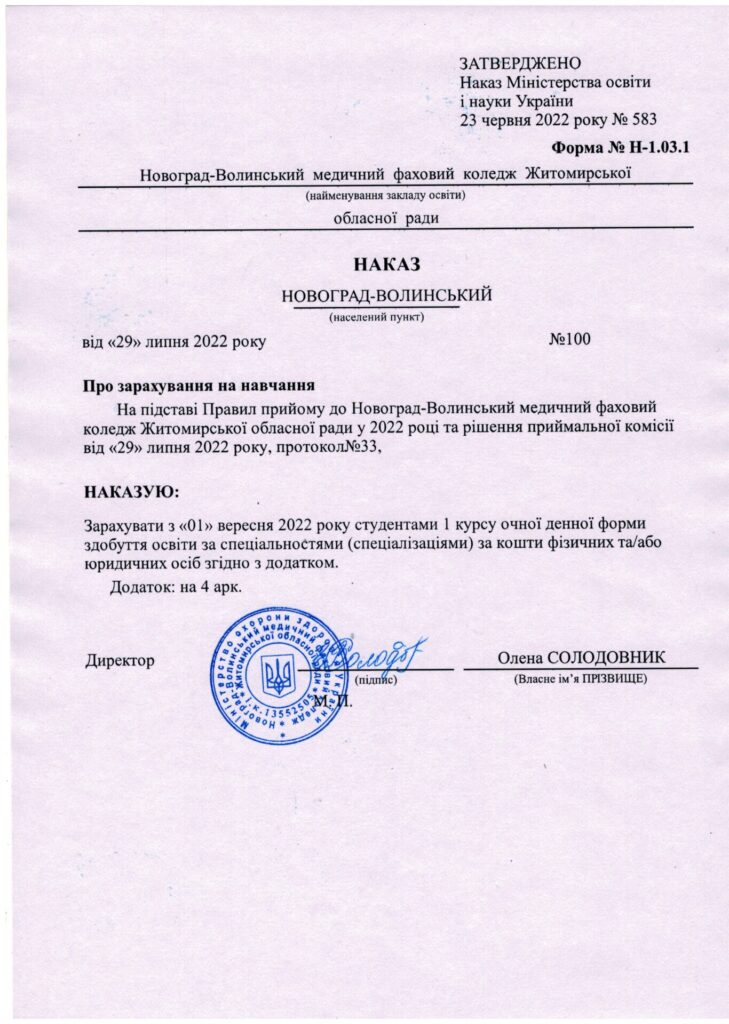 Наказ на зарахування за кошти фізичних або юридичних осіб спеціальність 223 Медсестринство, спеціалізація “Лікувальна справа” та “Сестринська справа” 29.07.2022 Якщо ви знайшли помилку, будь ласка, виділіть фрагмент тексту та натисніть Ctrl+Enter. Share