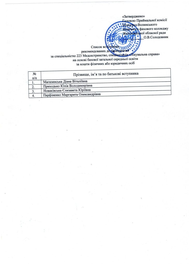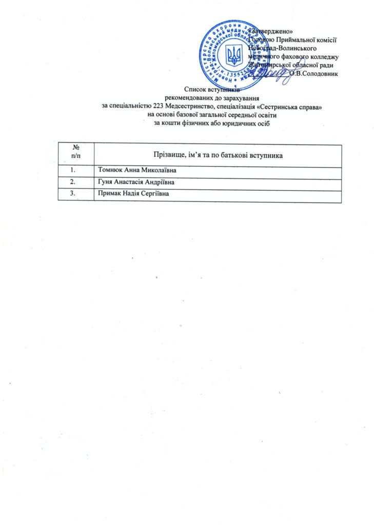 Список вступників рекомендованих до зарахування за спеціальністю 223 Медсестринство, спеціалізація “Лікувальна справа” та “Сестринська справа” на основі базової загальної середньої освіти за кошти фізичних або юридичних осіб
