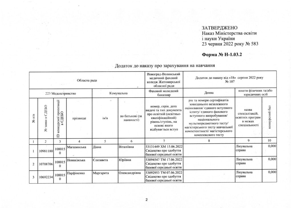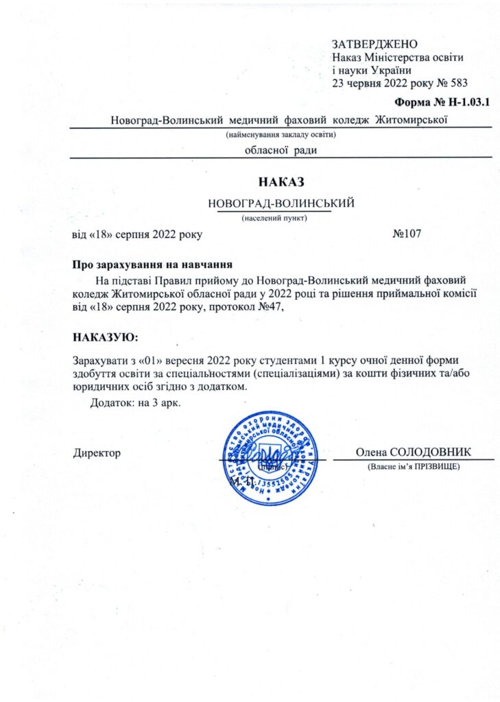 Наказ про зарахування на навчання за спеціальністю 223 Медсестринство, спеціалізація “Лікувальна справа” та “Сестринська справа” за кошти фізичних або юридичних осіб