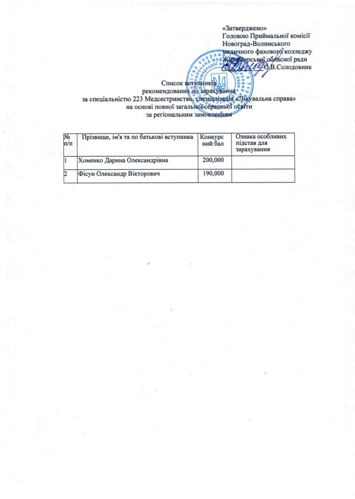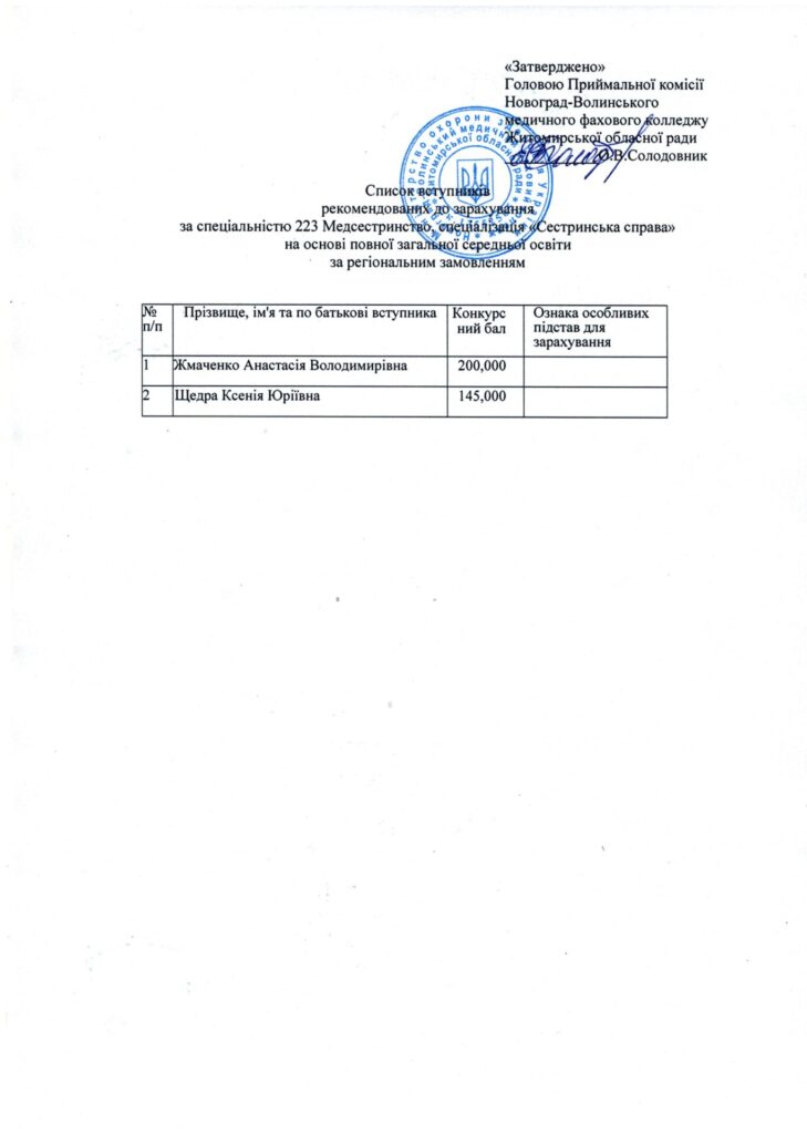 Список вступників рекомендованих до зарахування за спеціальністю 223 Медсестринство, спеціалізація “Лікувальна справа” та “Сестринська справа” на основі повної загальної середньої освіти за регіональним замовленням