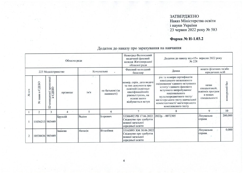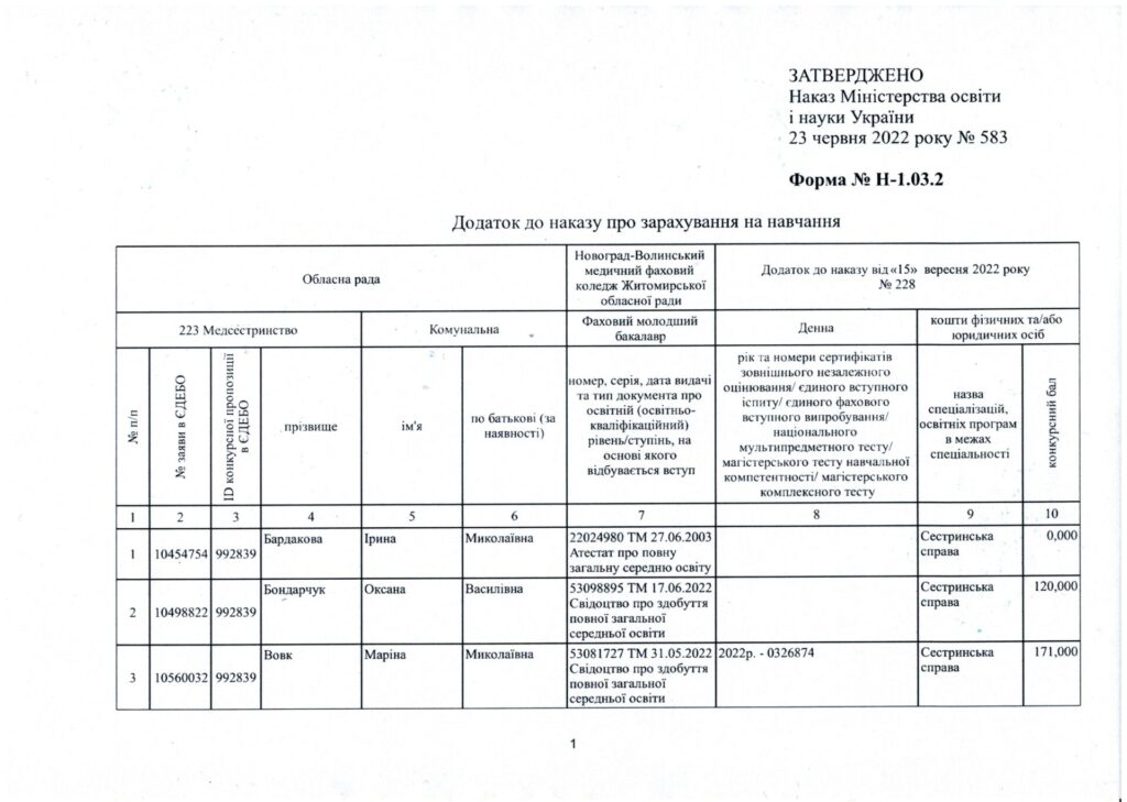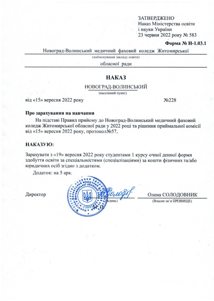 Наказ про зарахування на навчання спеціальність 223 Медсестринство, спеціалізація “Сестринська справа” та “Лікувальна справа” за кошти фізичних або юридичних осіб