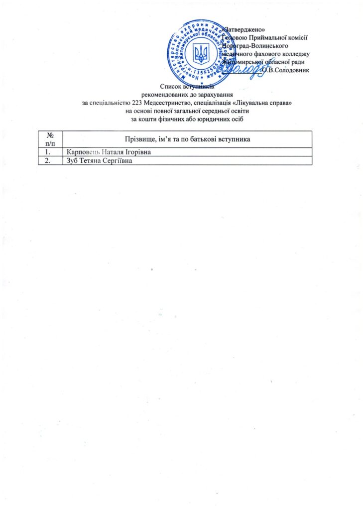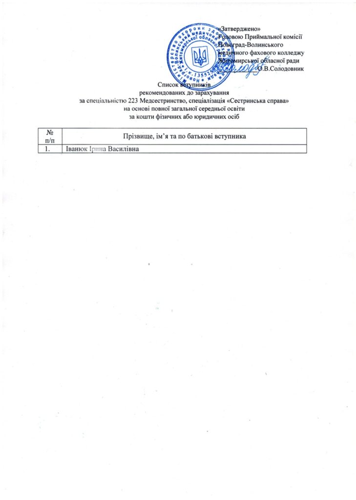 Список вступників рекомендованих до зарахування за спеціальністю 223 Медсестринство “Лікувальна справа” та “Сестринська справа” за кошти фізичних і юридичних осіб та рейтинговий список вступників від 24.09. 2022р.