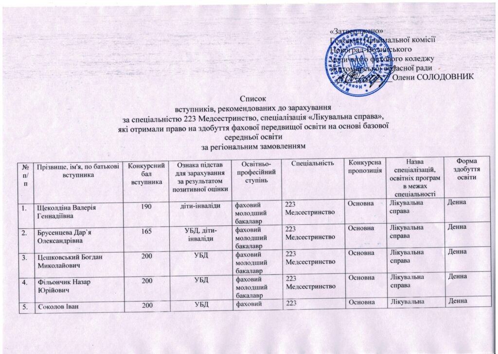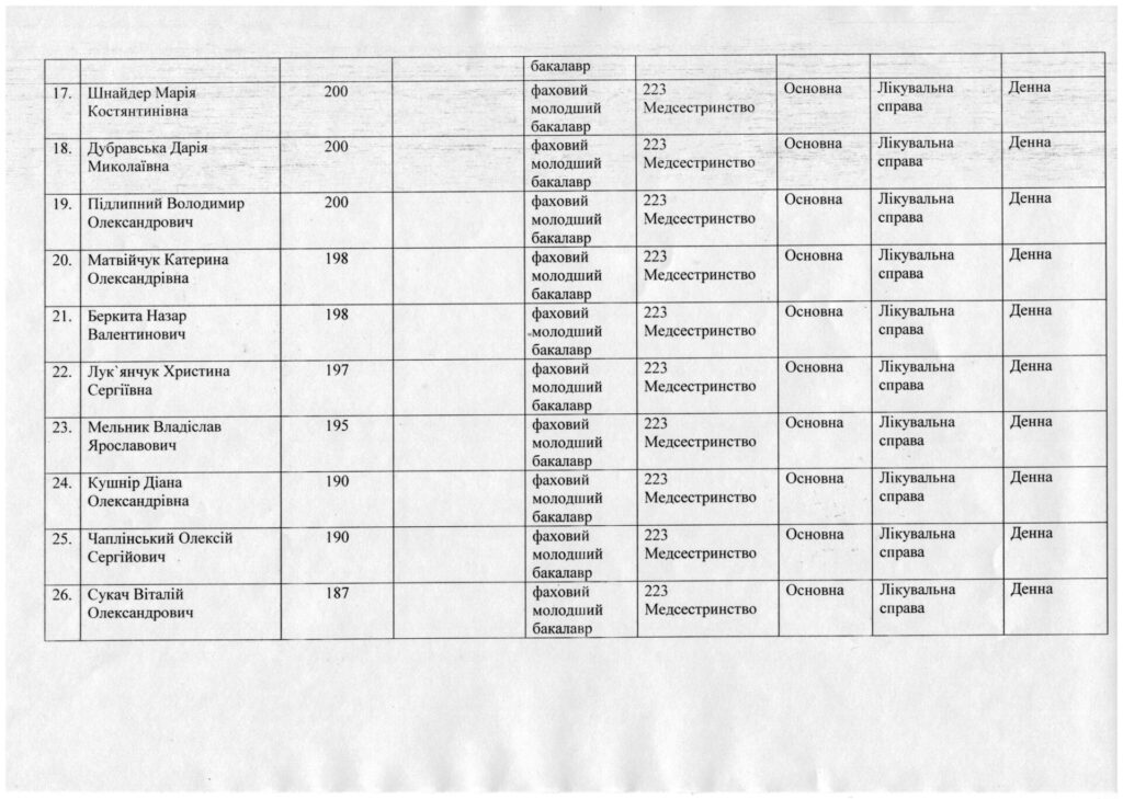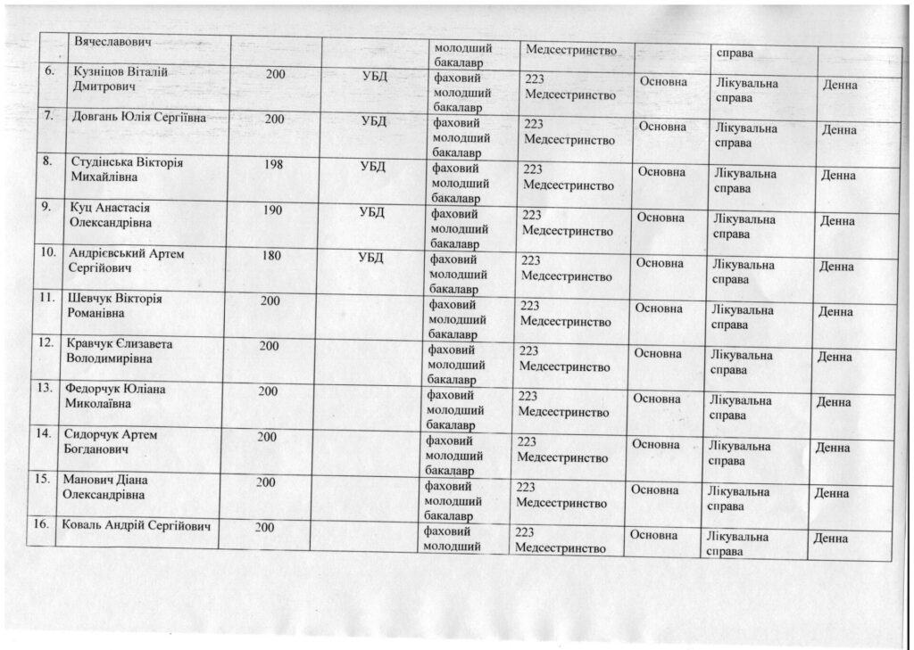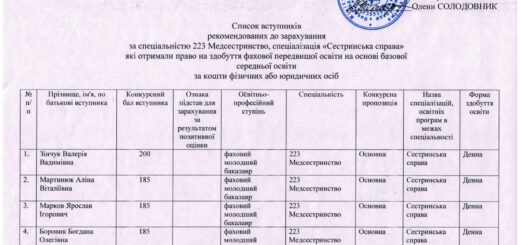- Попередня публікація Рейтинговий список вступників з урахуванням пільг та мотиваційних листів, на основі базової середньої освіти, за спеціальністю 223 Медсестринство, спеціалізація “Сестринська справа”