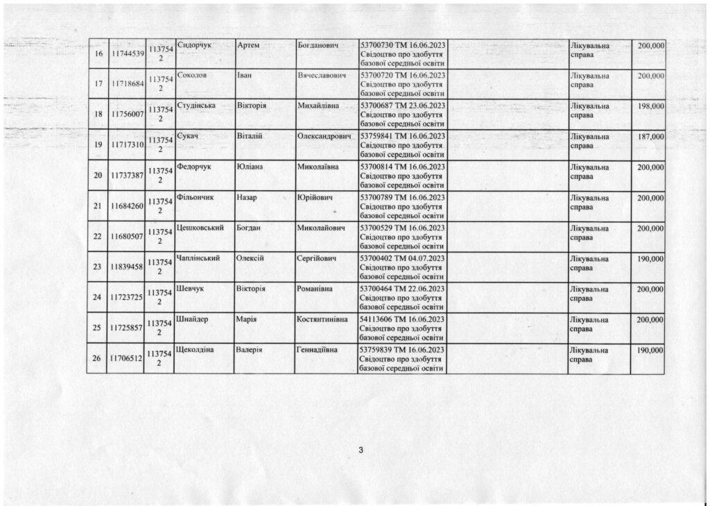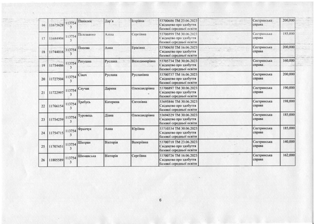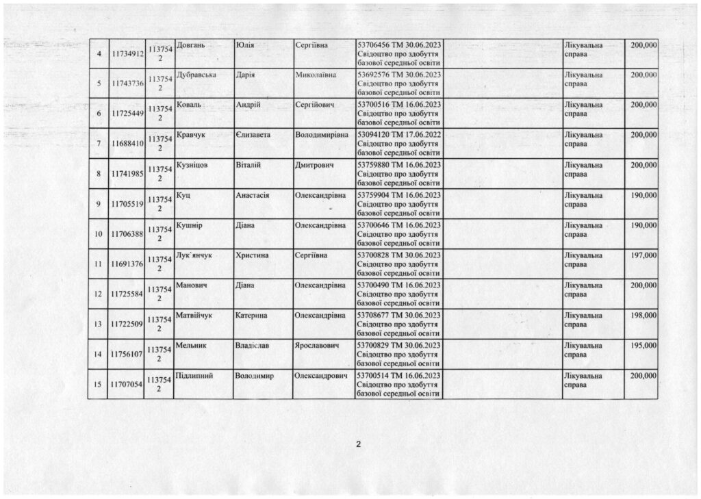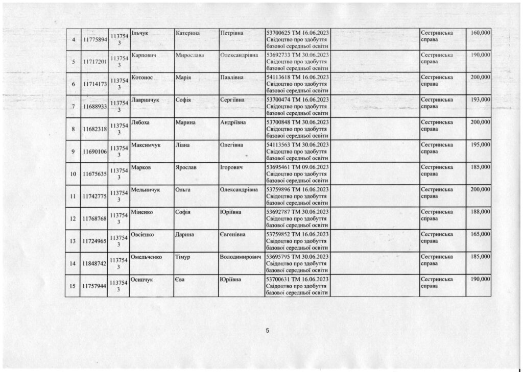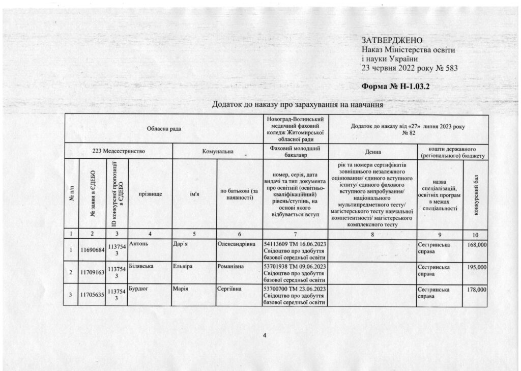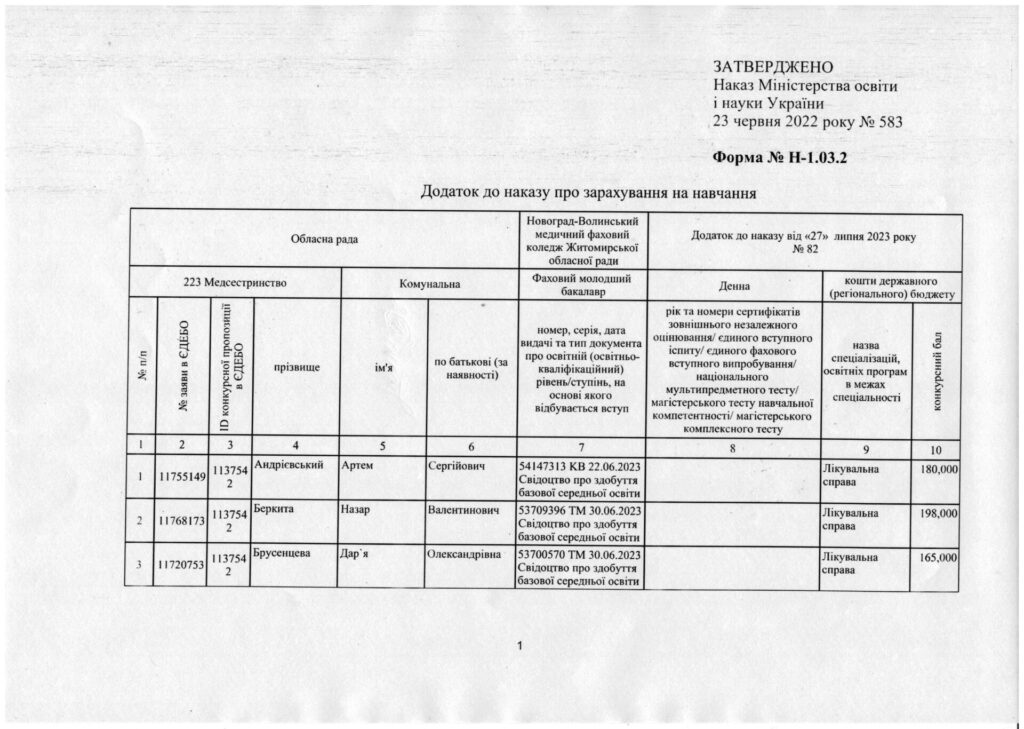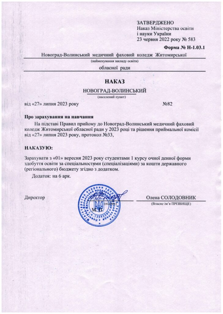 Наказ про зарахування на навчання за спеціальністю 223 Медсестринство, спеціалізація “Сестринська справа” та “Лікувальна справа” за регіональним замовленням від 27.07.2023 року.