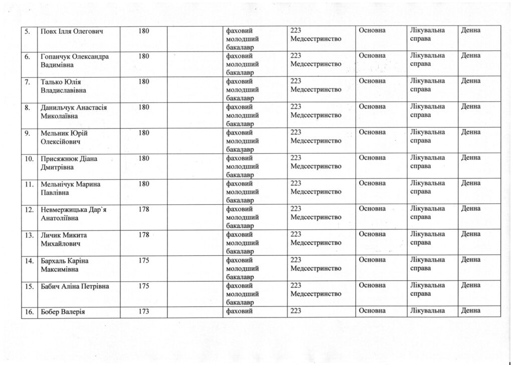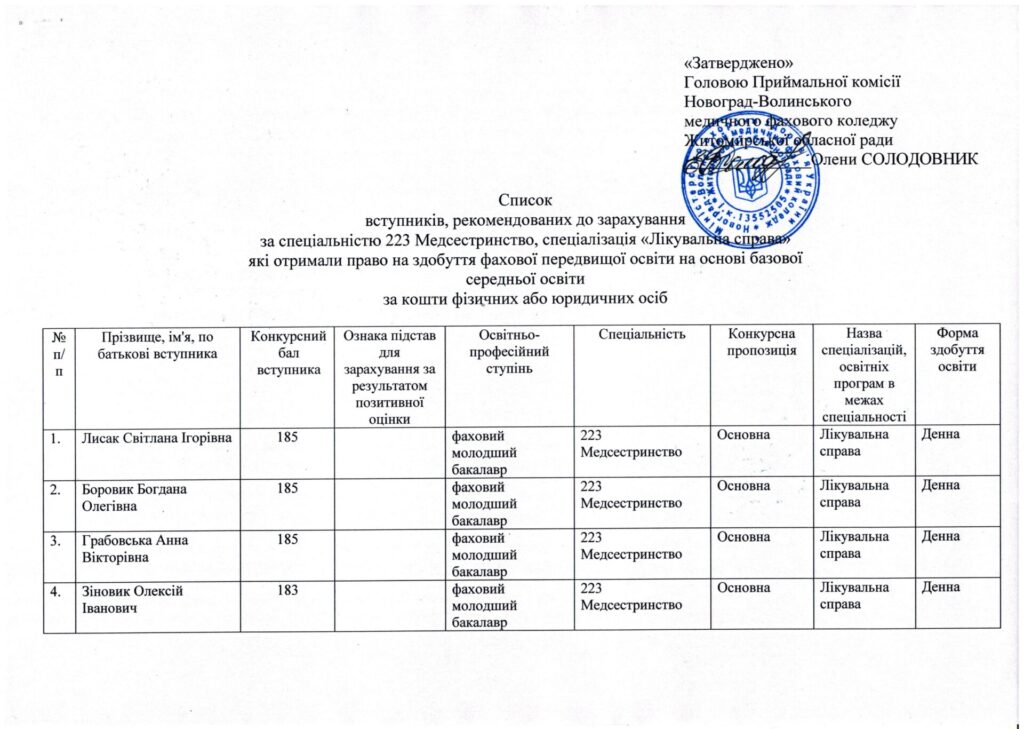 Список вступників, рекомендованих до зарахування за спеціальністю 223 Медсестринство, спеціалізація “Лікувальна справа”, які отримали право на здобуття фахової передвищої освіти на основі базової середньої освіти за кошти фізичних або юридичних осіб від 28.07.2023р.