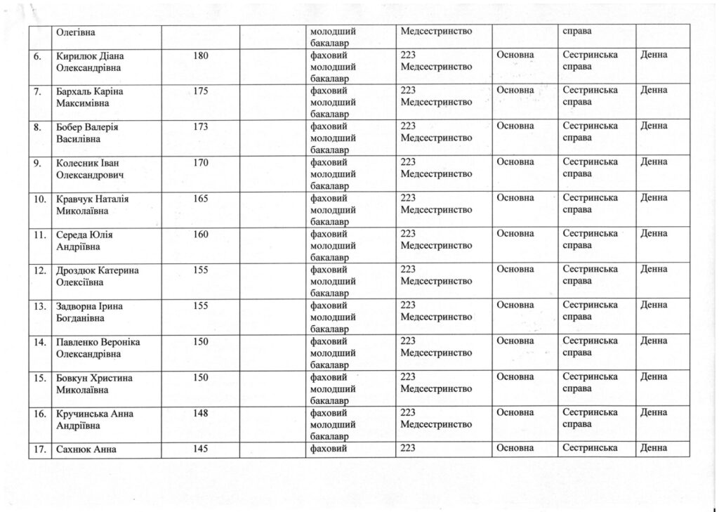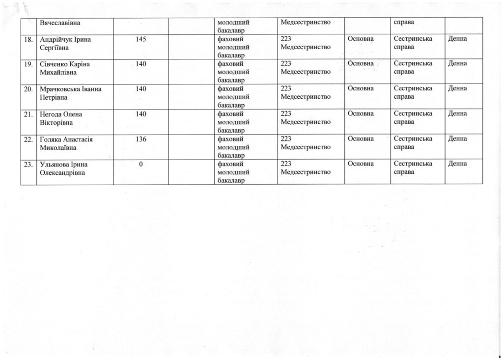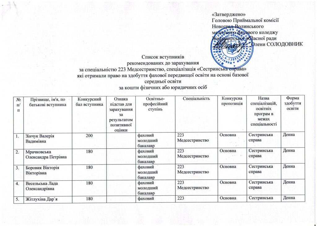 Список вступників, рекомендованих до зарахування за спеціальністю 223 Медсестринство, спеціалізація “Сестринська справа”, які отримали право на здобуття фахової передвищої освіти на основі базової середньої освіти за кошти фізичних або юридичних осіб від 28.07.2023р.