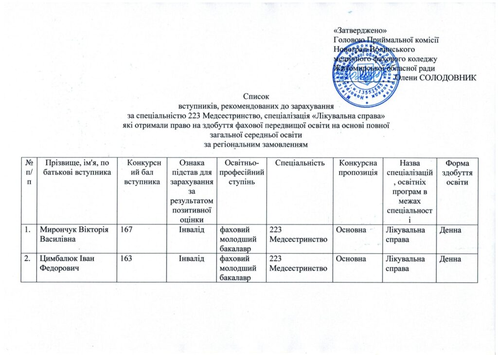 Список вступників, рекомендованих до зарахування за спеціальністю 223 Медсестринство, спеціалізація “Лікувальна справа”, які отримали право на здобуття фахової передвищої освіти на основі повної загальної середньої освіти за регіональним замовленням