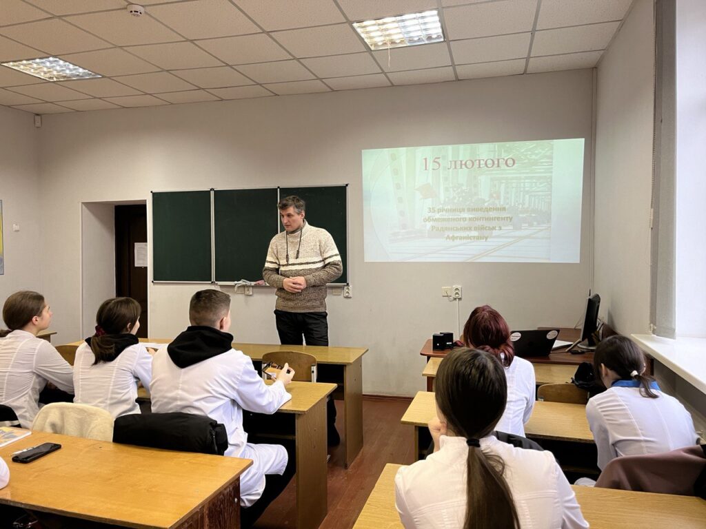 Щорічно на державному рівні українська спільнота відзначає День вшанування учасників бойових дій на території інших держав. Тож і сьогодні, 15 лютого, в день відзначення скорботного Дня пам’яті воїнів-афганців, тих, хто пережив цю війну, тих, хто не дожив, не доспівав, не докохав, викладачем Захисту України Миколою Стадніком проведено годину-реквієм, присвячену усім, хто вірив, що виконує інтернаціональний обов’язок у цій брудній і підступній війні… Війні, яка в чужій країні залишила гіркий, болючий слід у долях українських родин…