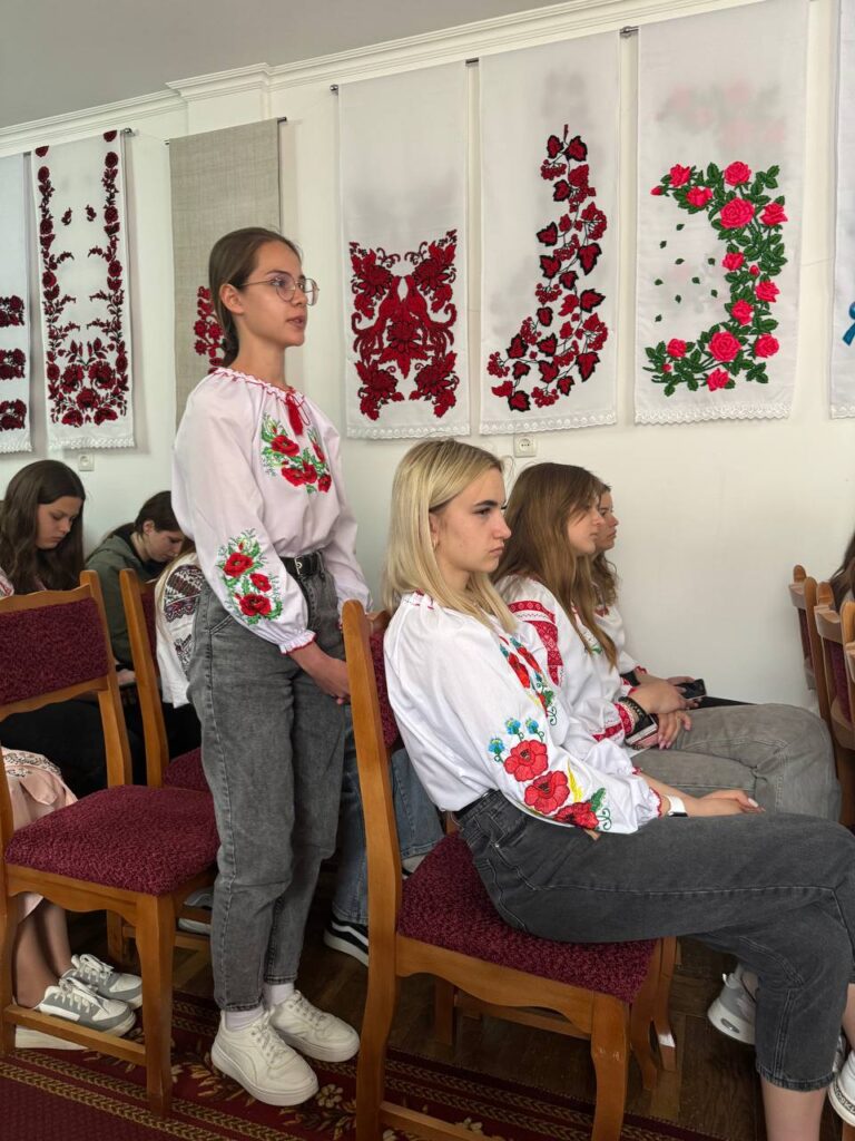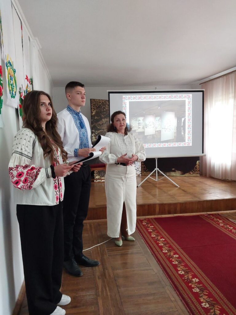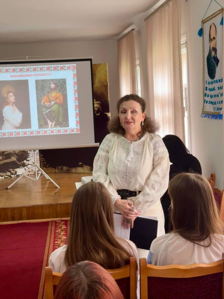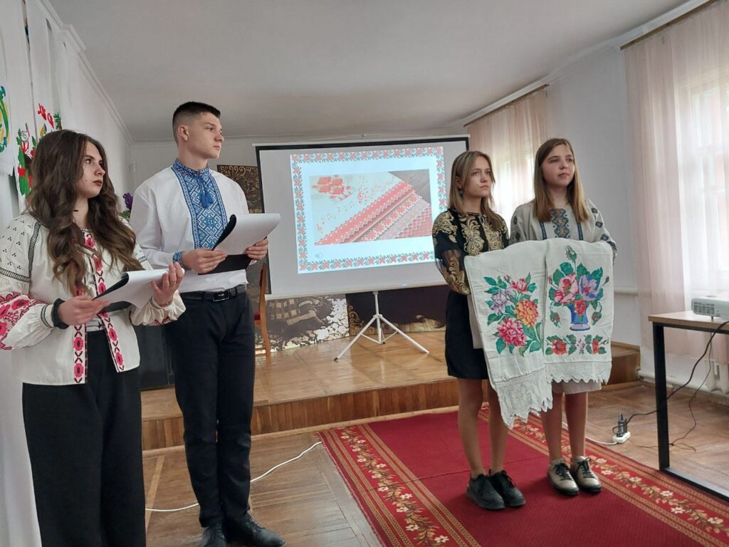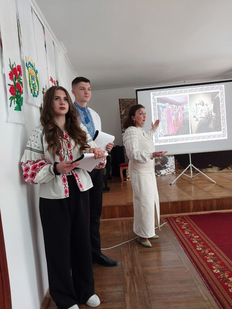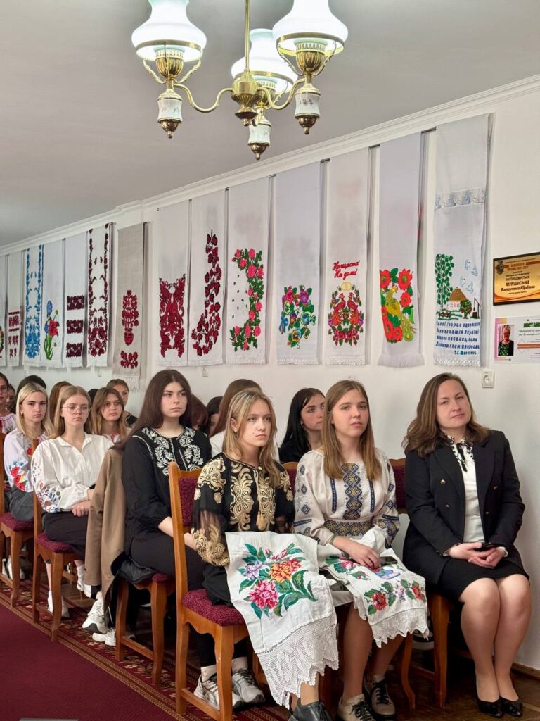 Галина КОТЮК, викладач української мови та літератури, привернула увагу студентів до унікальних робіт нашої землячки – майстрині народної творчості Валентини Муравської, техніка виконання якої – унікальна. Зі смаком та любов’ю підібрані кольори та узори – це сучасне мистецтво, але разом з тим – це доводить, що у нашому краї вишивка продовжує жити, розвиватися і прикрашати своїми оберегами наші оселі, людей і наш край.