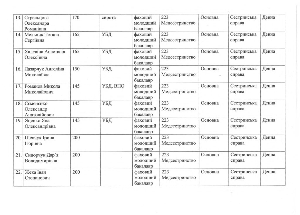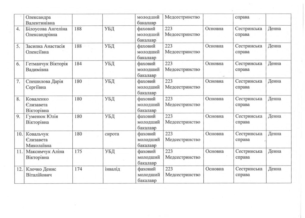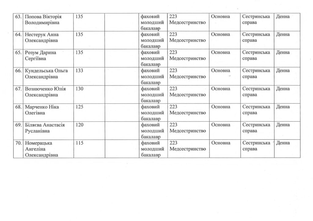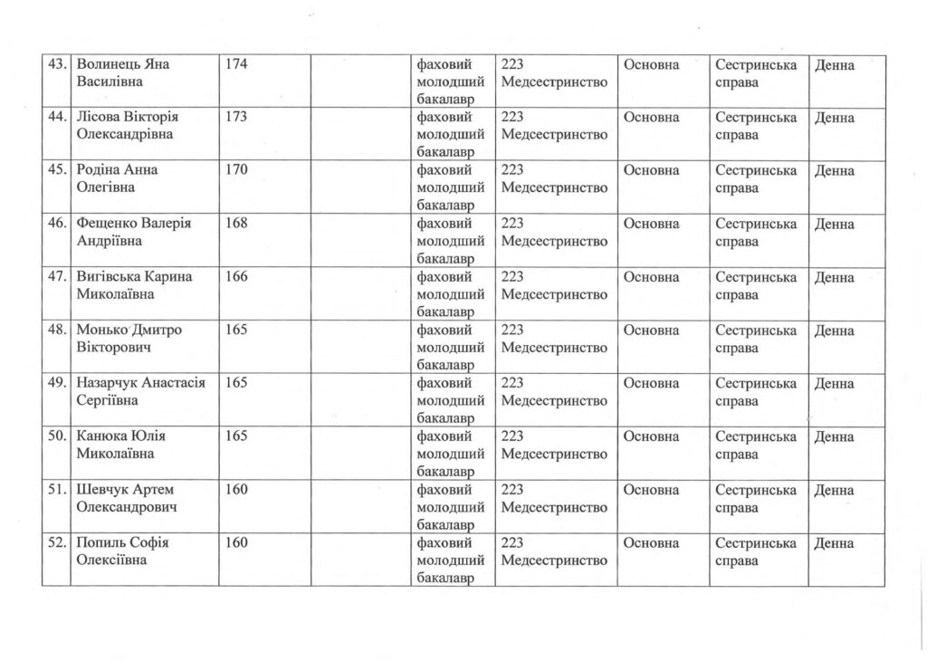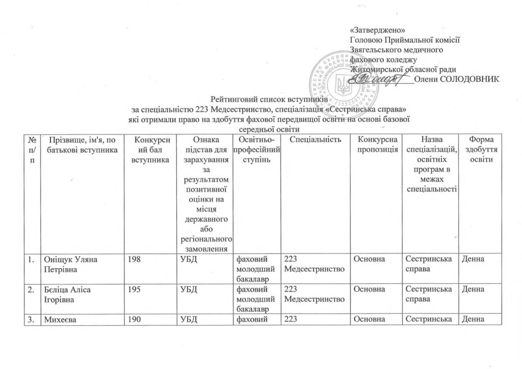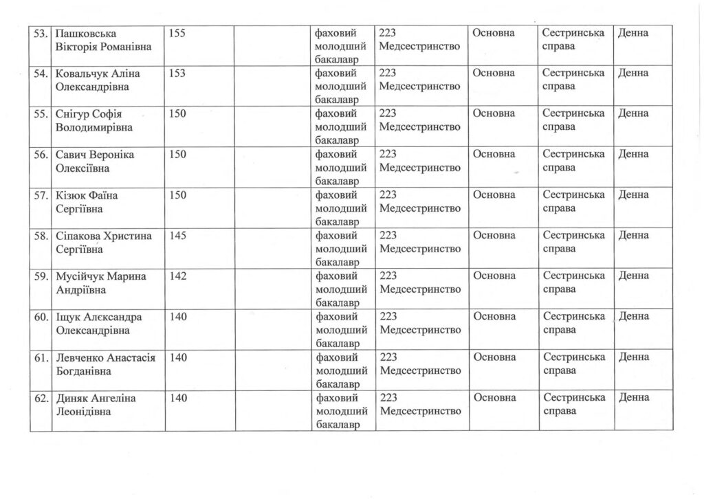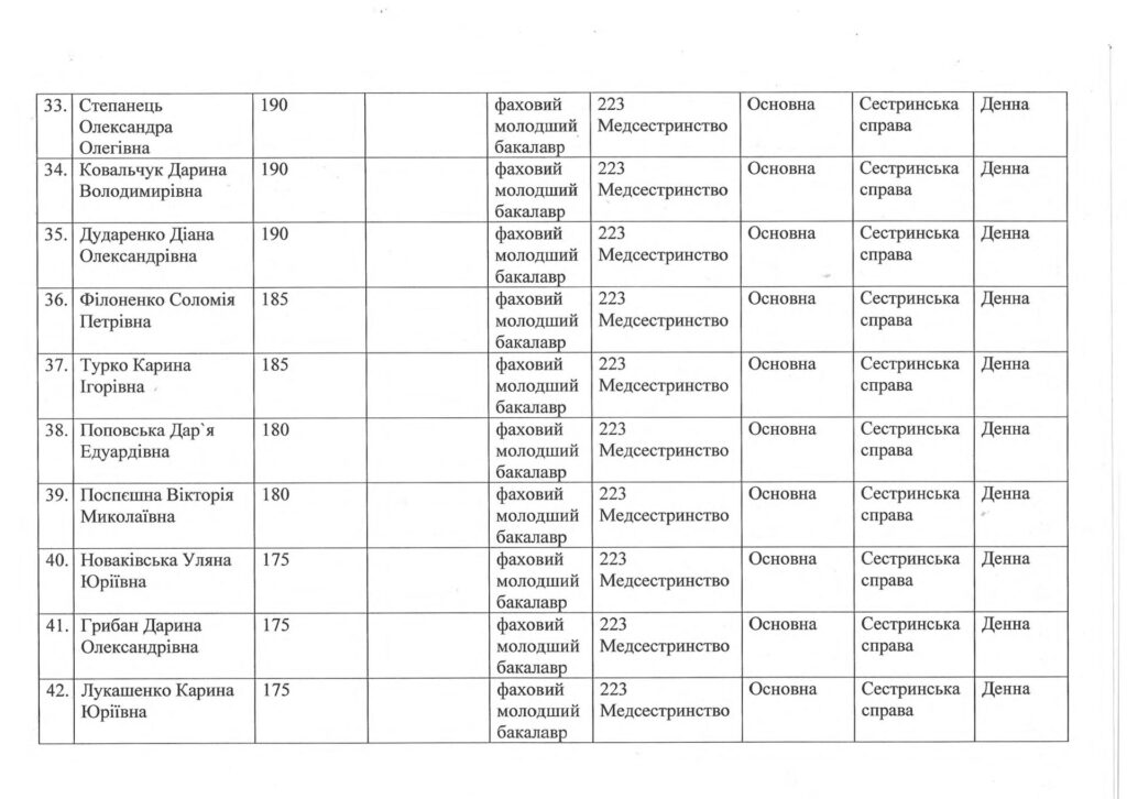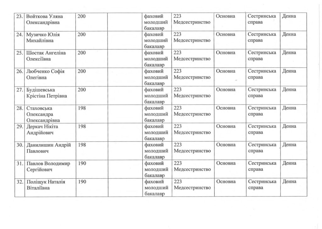 Рейтинговий список вступників з урахуванням пільг та мотиваційних листів, на основі базової середньої освіти, за спеціальністю 223 Медсестринство, спеціалізація “Сестринська справа”