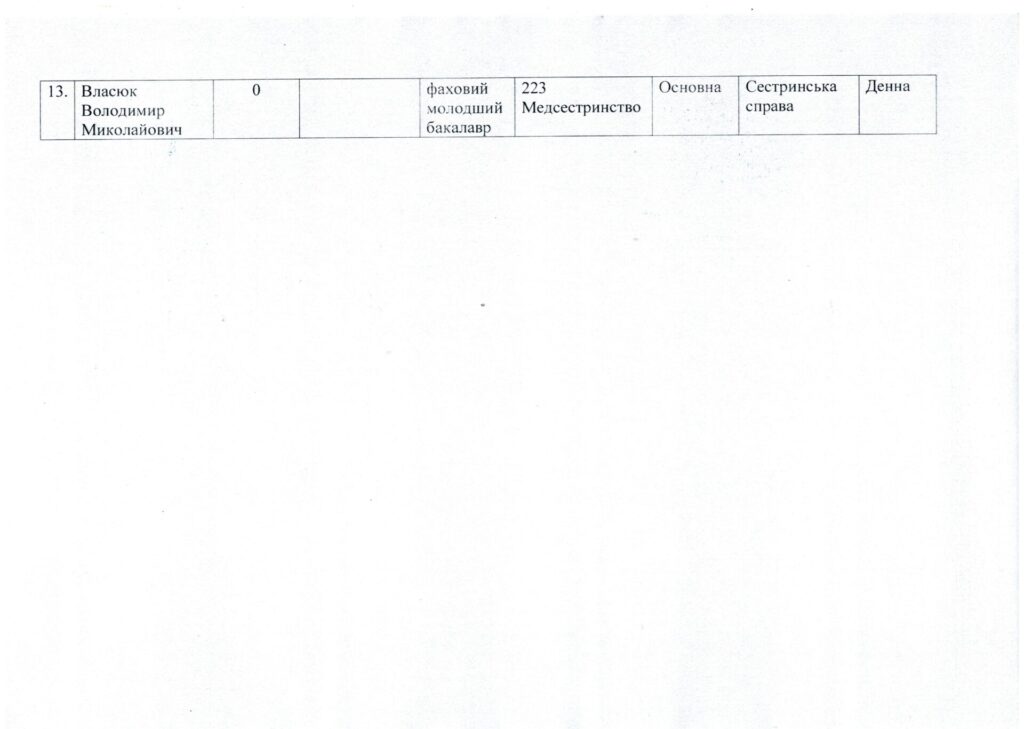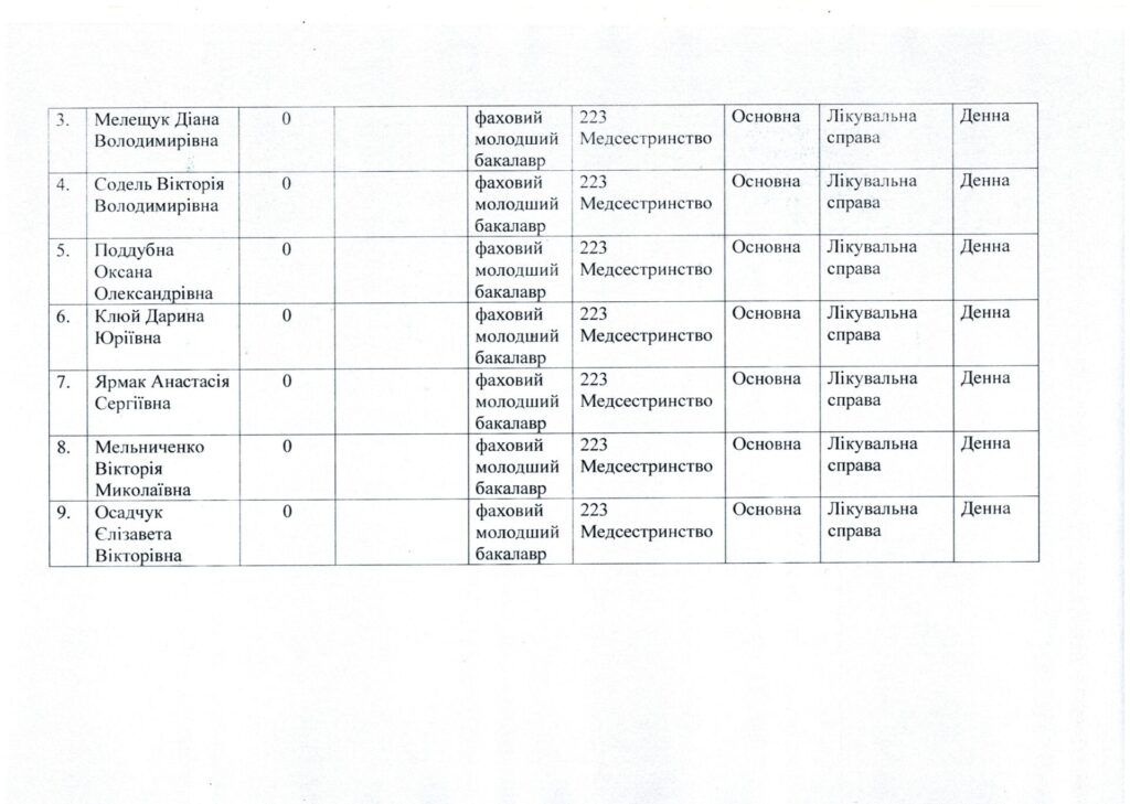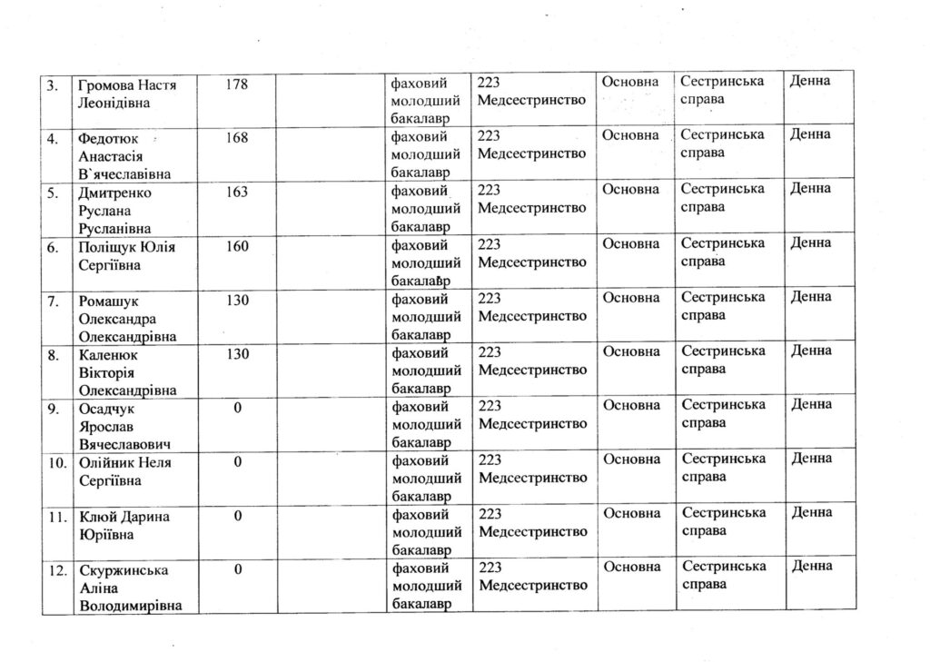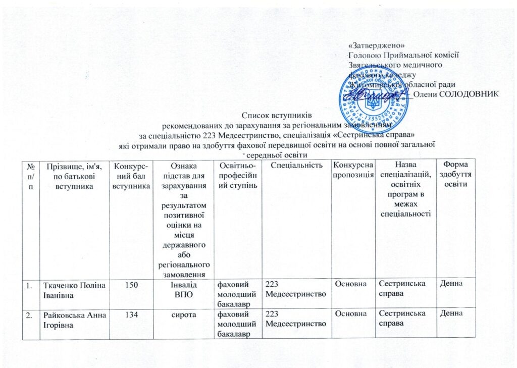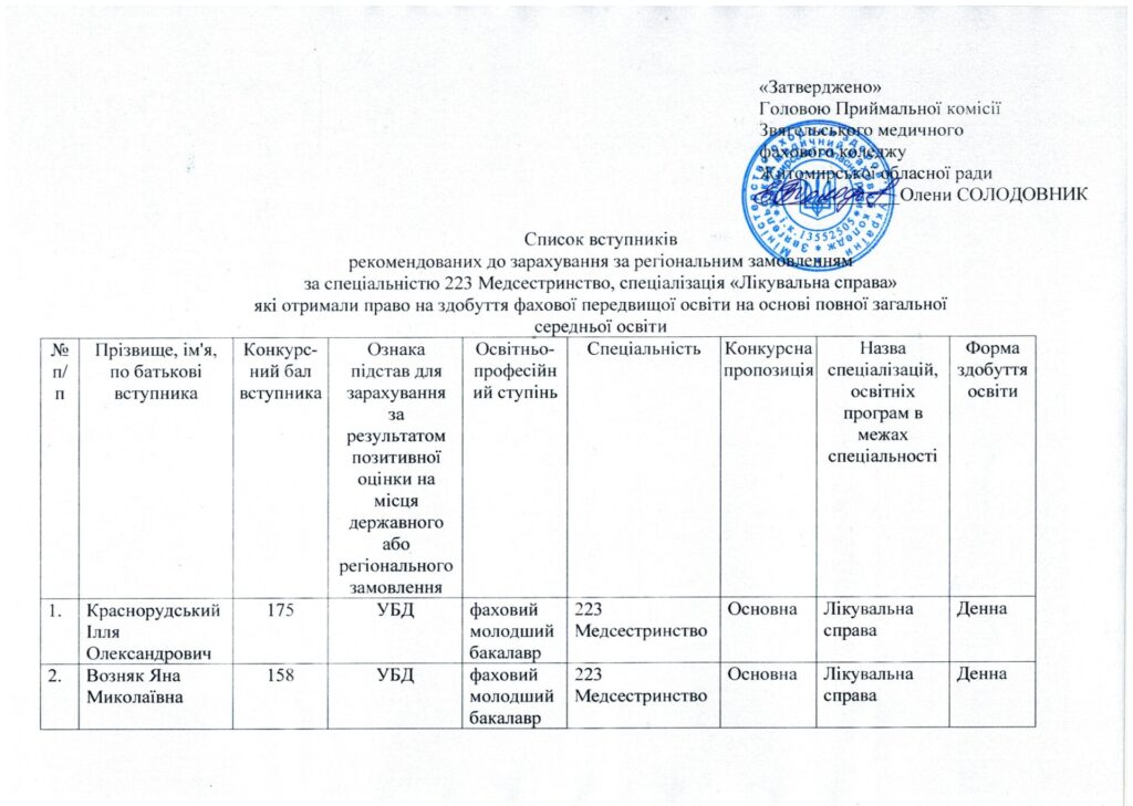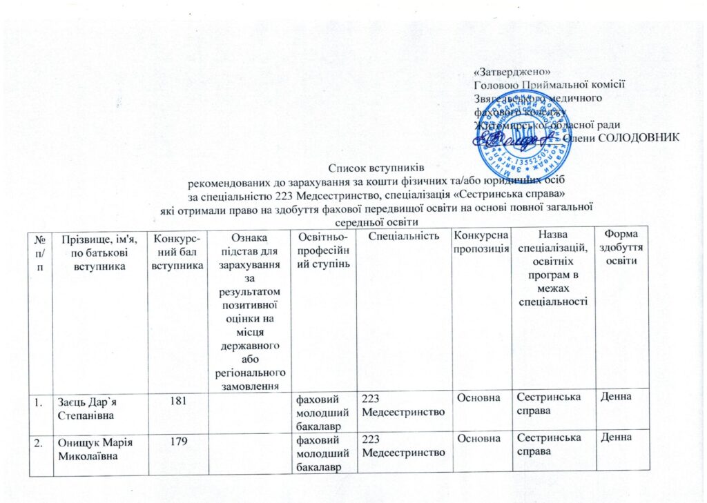 Список вступників, рекомендованих до зарахування за спеціальністю 223 Медсестринство, спеціалізація “Сестринська справа” та “Лікувальна справа”, які отримали право на здобуття фахової передвищої освіти на основі повної загальної середньої освіти за регіональним замовленням та за кошти фізичних та/або юридичних осіб від 05.08.2024 р.