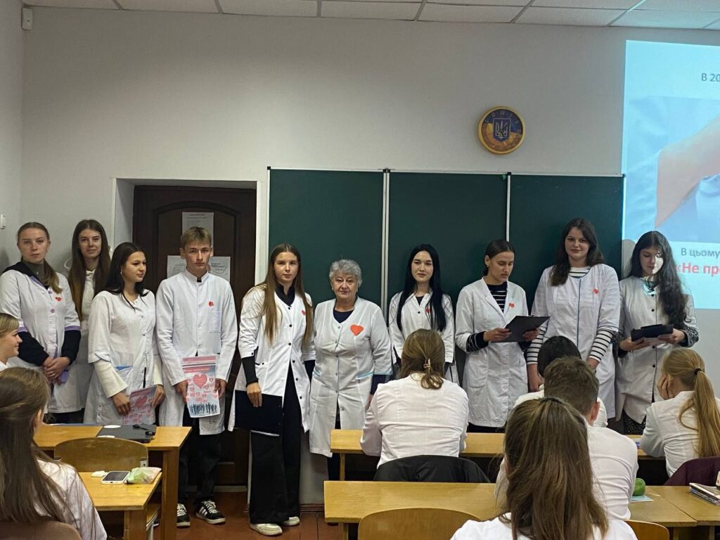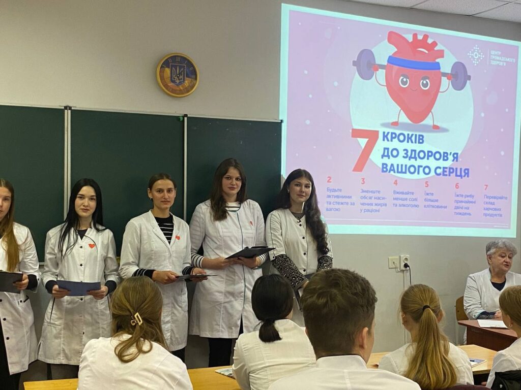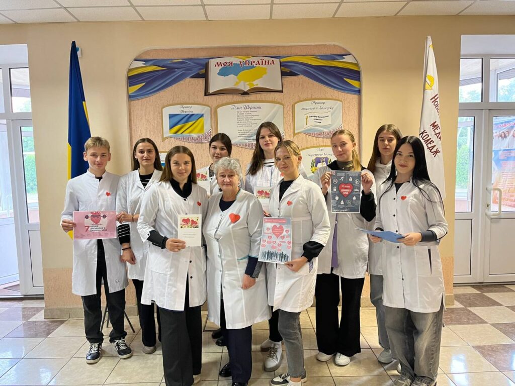 Не стоять осторонь і студенти Звягельського медичного фахового коледжу. 29 вересня студенти ІVкурсу групи С 84 відділення «Сестринська справа» під керівництвом викладача внутрішньої медицини та сімейної медицини Гаргуновської І.М., підготовили і провели інформаційну годину для студенів І курсу групи Л54 відділення «Лікувальна справа». В ході заходу студенти І курсу були ознайомлені з анатомією та фізіологією серця, факторами ризику, основними ознаками та заходами профілактики захворювань серцево-судинної системи. Особливу увагу присутніх звернули увагу на такі питання, як шкідливість паління, вживання алкоголю, важливість раціонального харчування та активного способу життя. Студенти першого курсу приймали активну участь в обговорення цих важливих питань: відповідали на запитання, розраховували свій індекс маси тіла, формулювали висновки щодо здорового способу життя. В цілому захід пройшов у дружній невимушеній обстановці. І в кінці всі присутні пообіцяли своїм серцям: не палити, не вживати алкоголь, уникати транс-жирів, збільшити вживання овочів і фруктів, більше рухатись, уникати стресів, зменшити вживання солі, організовувати повноцінний сон і відпочинок. У глибині вашого тіла б’ється серце. Годинник, заведений один раз на все життя: серцю працювати важко. Не заважайте йому. Ми всім бажаємо успіхів! Сильного, благородного серця!