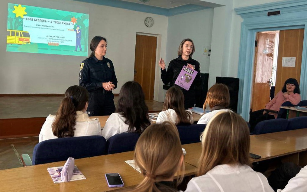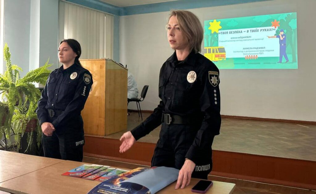 Студенти мали нагоду поспілкуватися з працівниками Звягельського РВП: Оленою Кайданович, старшим інспектором сектору ювенальної превенції, та Анжелою Радзивіл, інспектором з дотримання прав людини на тему «Твоя безпека – в твоїх руках!
