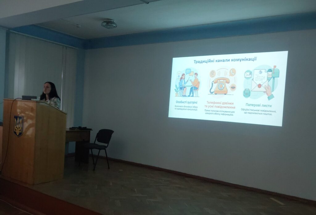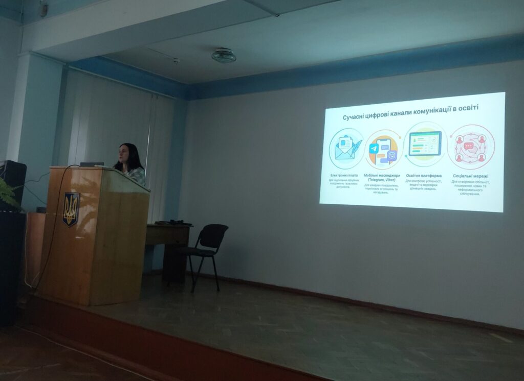 Сучасні канали взаємодії з батьками студентів – Ольга Гутель, завідуюча відділенням «Профільна освіта» акцентувала увагу на важливості прозорої та оперативної комунікації з батьками. Розглянуто ефективні інструменти взаємодії: онлайн-зустрічі, цифрові сервіси, що дозволяють батькам бути більш залученими в освітній процес. Особливу увагу приділено формуванню партнерських відносин «коледж – студент – батьки».