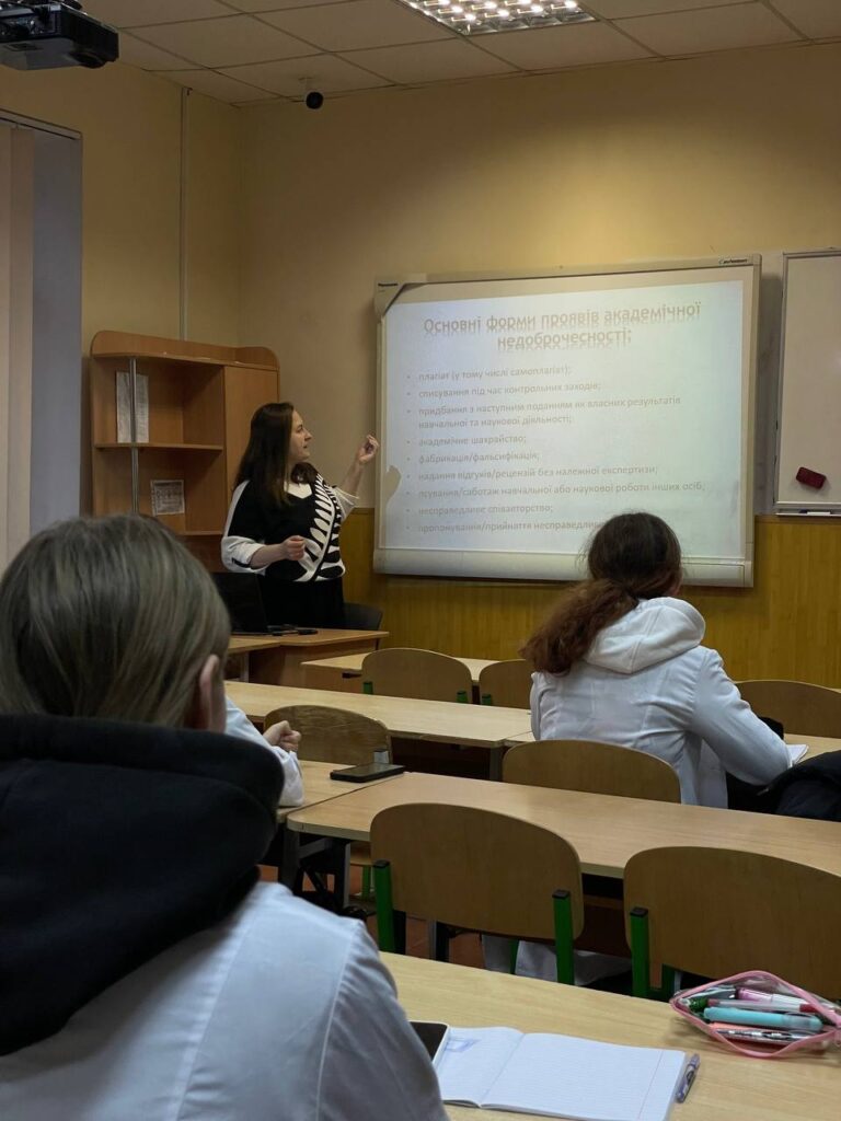 Сьогодні у рамках Тижня доброчесності, який триває з 1 до 9 грудня 2025 року, у коледжі відбувся Всеукраїнський урок доброчесності. Захід провели викладачі Микола ДРАЧ, Наталія МУХАРОВСЬКА та Ірина ЗІНЧУК для здобувачів освіти І курсу спеціалізацій «Лікувальна справа» та «Сестринська справа». Під час заняття студенти долучилися до змістовного обговорення ключових принципів академічної доброчесності та їхнього значення у професійному становленні майбутніх медичних працівників.