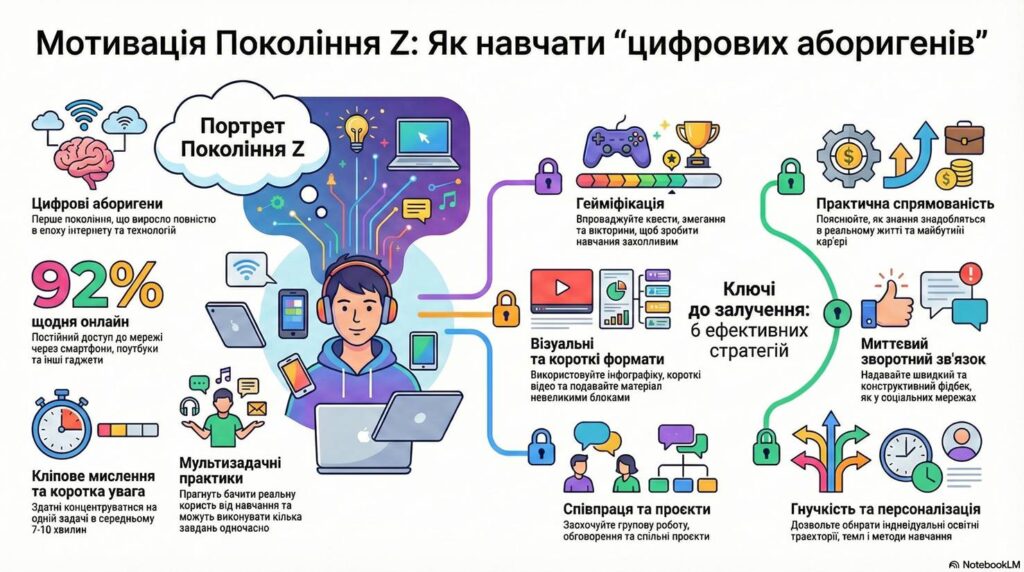 Скляні очі, ледь помітне сяйво екрана смартфона під партою, відчутна тиша там, де мали б лунати жваві запитання. Якщо ця картина — ваша щоденна реальність, ви не самотні. Багато викладачів та батьків сьогодні стикаються з викликом: перевірені роками методи навчання просто не працюють із сучасною молоддю, а будь-яка спроба викликати інтерес розбивається об стіну байдужості. Причина цієї прірви в тому, що перед нами — покоління Z, або «зумери». Щоб зрозуміти їх, ми повинні спершу прийняти фундаментальну тезу: технології для них — це не інструмент, яким вони користуються, а середовище, в якому вони живуть. Це перше покоління «цифрових аборигенів», яке виросло у світі, де інтернет був завжди. Їх мозок, спосіб мислення та сприйняття інформації кардинально відрізняються, адже вони постійно обробляють кілька потоків даних одночасно. Але це не вирок. Їх відкритість до нового, бажання вчитися та покращувати світ — це потужний ресурс, який просто потребує іншого підходу. 23 грудня Лашевич Ольга під час тренінгу для викладачів нашого коледжу яскраво розкрила дев’ять практичних стратегій, що ґрунтуються на психології та цифрових звичках «зумерів». Це конкретні інструменти, які допомагають нам знайти з ними спільну мову та перетворити навчання на захопливий і продуктивний процес.