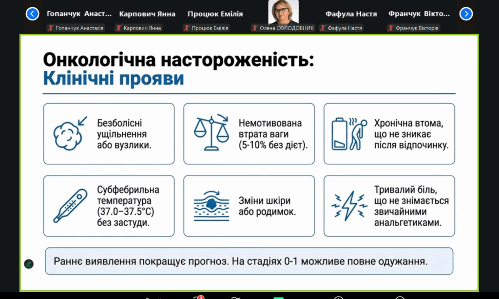 - найбільш поширеними видами раку та їх клінічними проявами;
