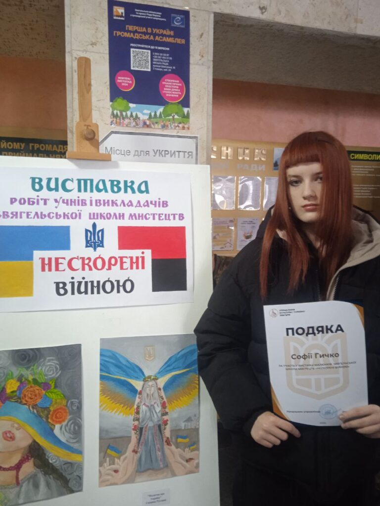 Її чудові роботи були представлені на творчій виставці, приуроченій трагічній даті – дню повномасштабного вторгнення рашистів на рідну Україну. За участь у цьому заході Софія відзначена Подякою управління культури і туризму Звягеля.