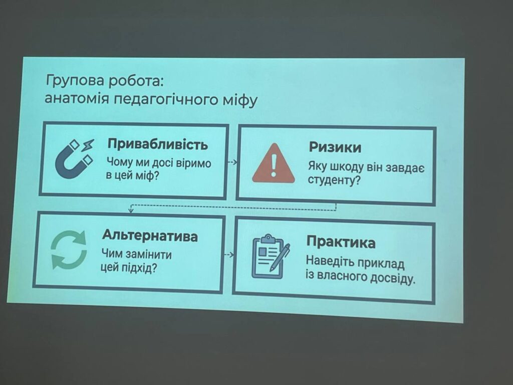 Завершила захід діалог-платформа «Розвіюємо педагогічні міфи: крок до нової культури викладання», яку провела методист Ірина Зінчук. У форматі відкритого обговорення викладачі мали змогу критично осмислити усталені підходи до навчання, поділитися власним досвідом та знайти нові ідеї для вдосконалення освітнього процесу.