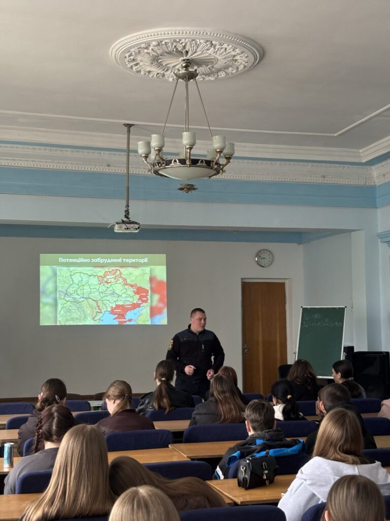 Співробітником ДСНС було проведено профілактичну бесіду-діалог із здобувачами щодо мінної безпеки, правил обережного поводження у разі виявлення небезпечних предметів, уникання небезпечних та невідомих територій тощо.