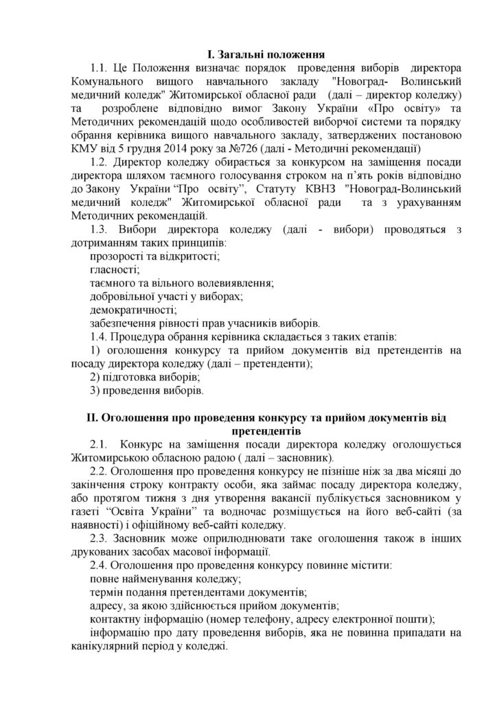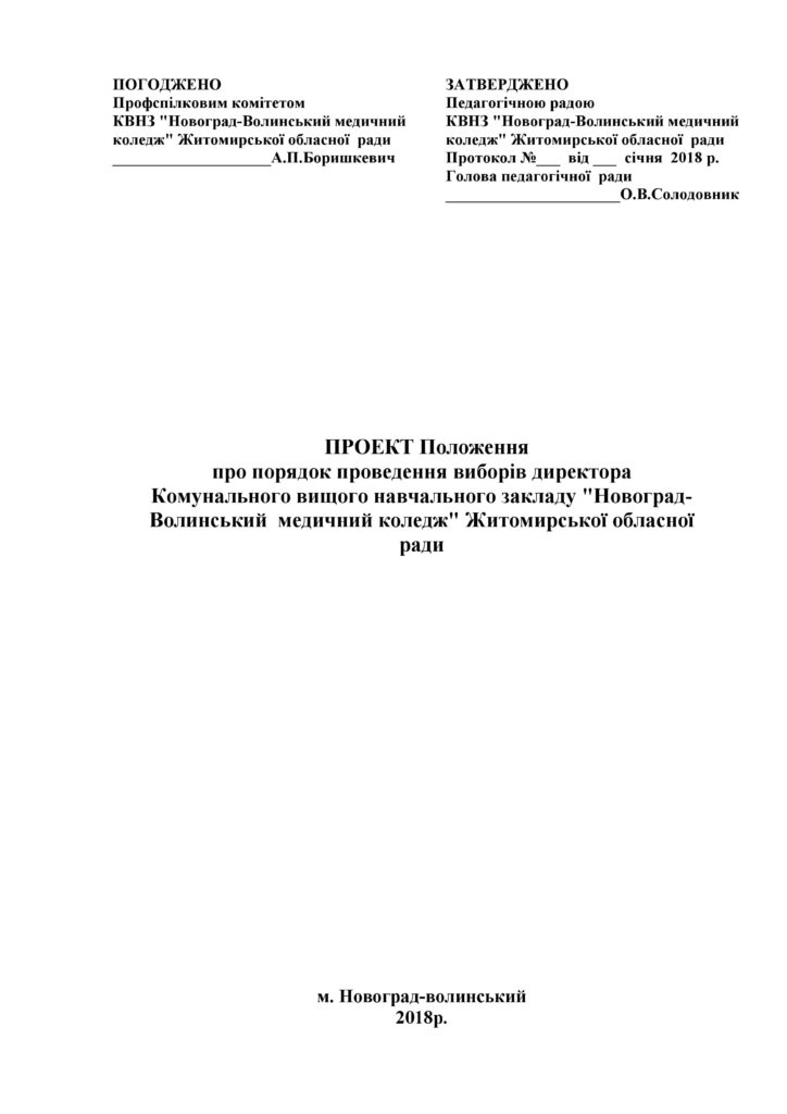 ПРОЕКТ Положення про порядок проведення виборів директора Комунального вищого навчального закладу “Новоград- Волинський медичний коледж” Житомирської обласної ради