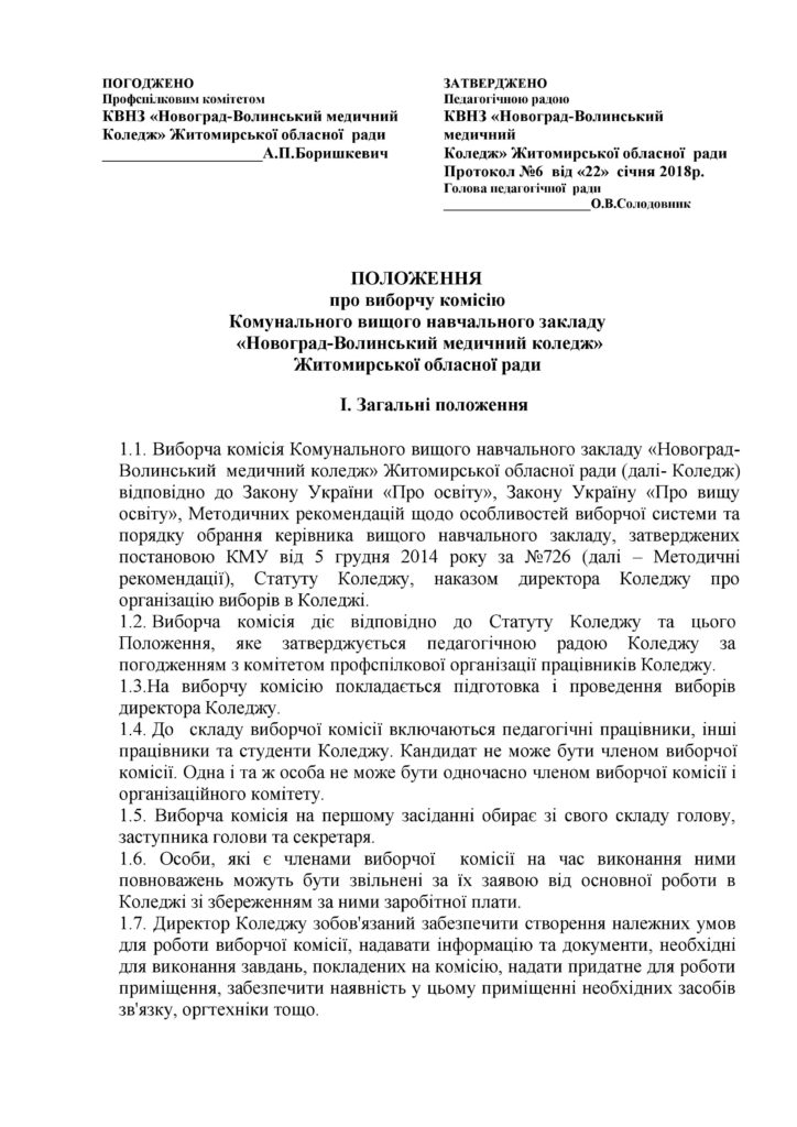 - Наступна публікація ПОЛОЖЕННЯ про порядок обрання представників з числа штатних працівників, які не є педагогічними працівниками, для участі у виборах директора КВНЗ “Новоград-Волинський медичний коледж” Житомирської обласної ради