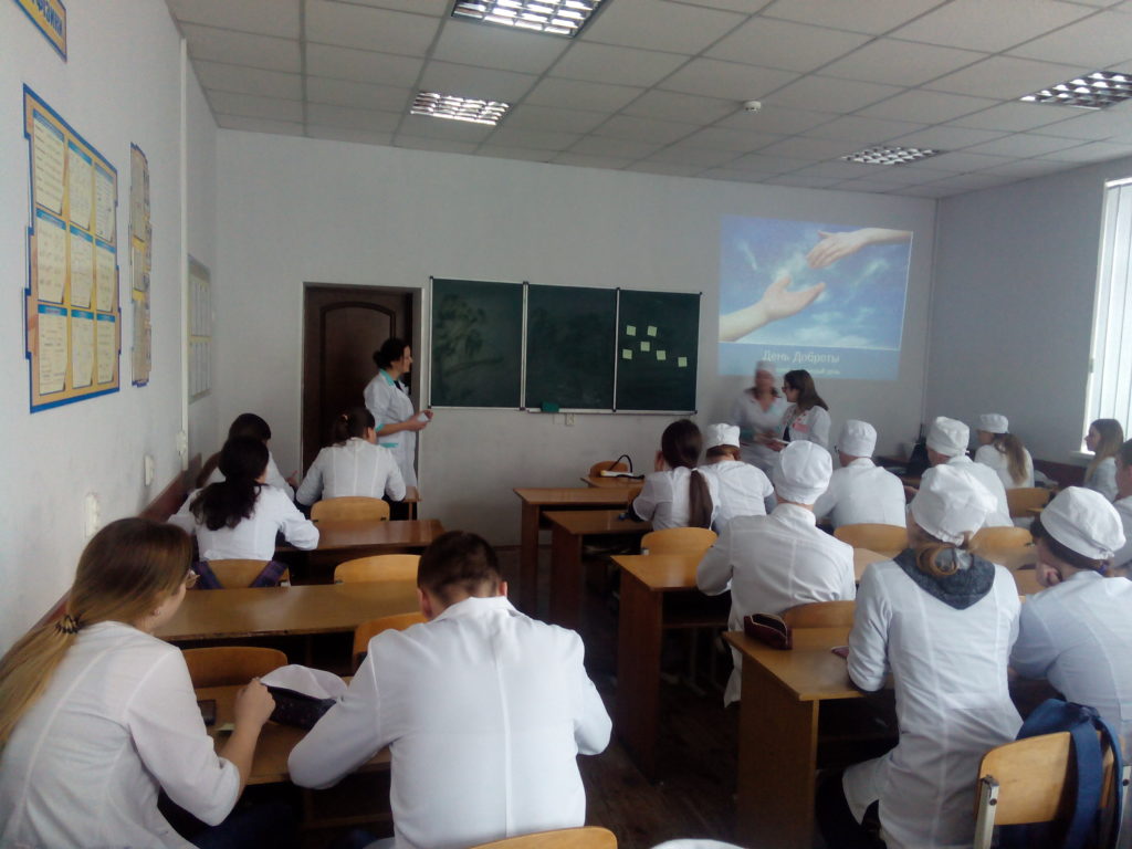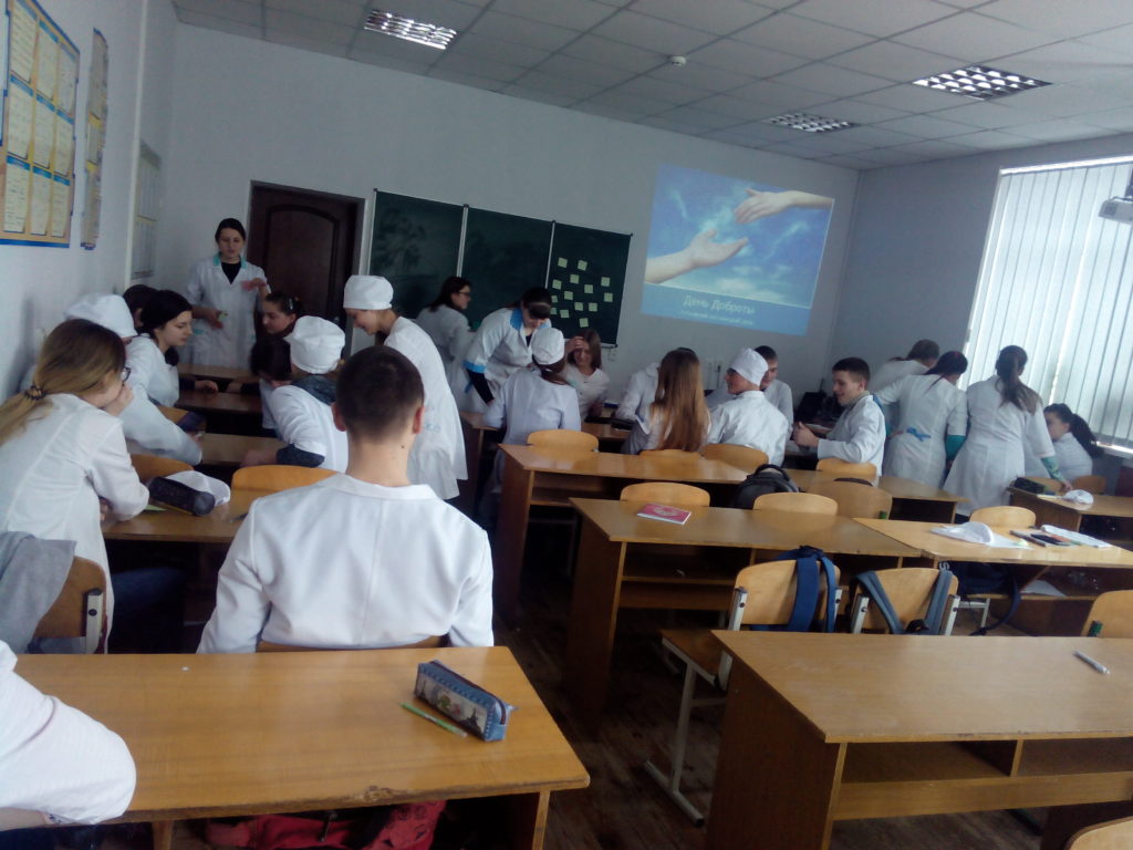 Студенти першокурсники розповідали про свої добрі справи, студенти-волонтери провели анкетування та на завершення виховної години зробили велике коло зі студентів, які об’єдналися за руки і говорили один одному слова добра і теплоти.
