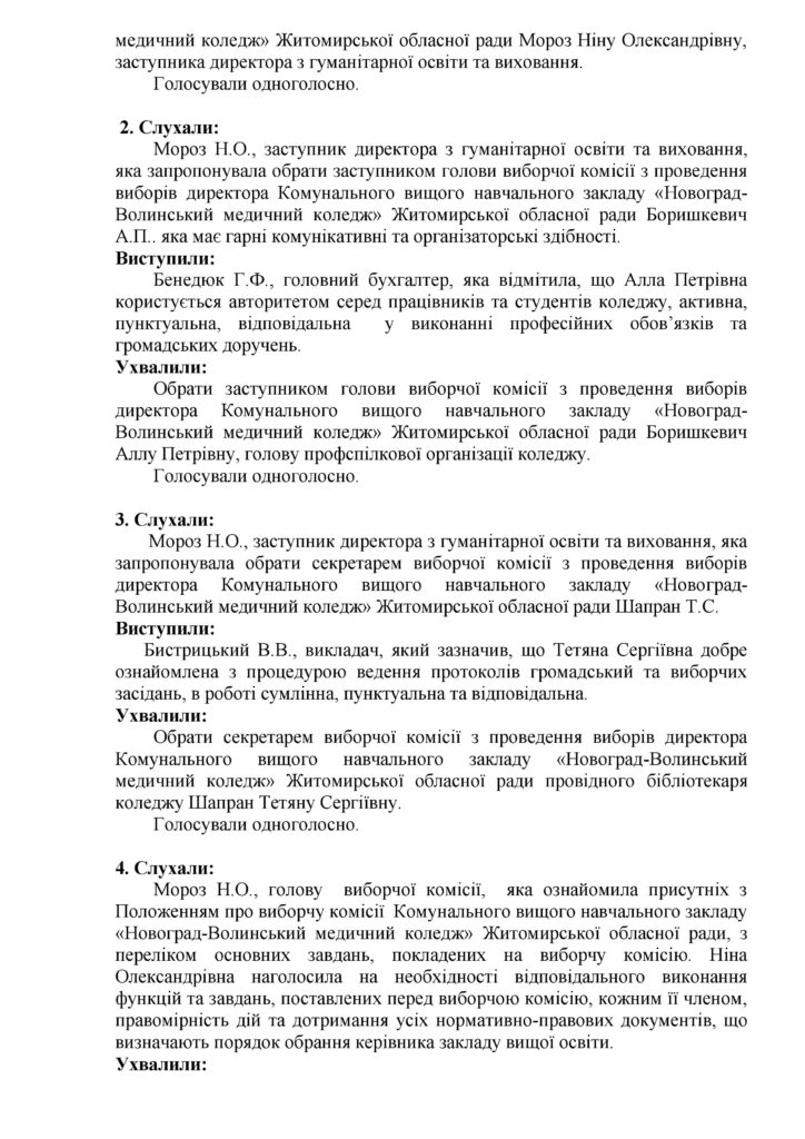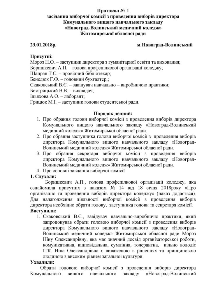 Протокол №1 засідання виборчої комісії з проведення виборів директора КВНЗ “Новоград-Волинський медичний коледж” 16.02.2018 Якщо ви знайшли помилку, будь ласка, виділіть фрагмент тексту та натисніть Ctrl+Enter. Share