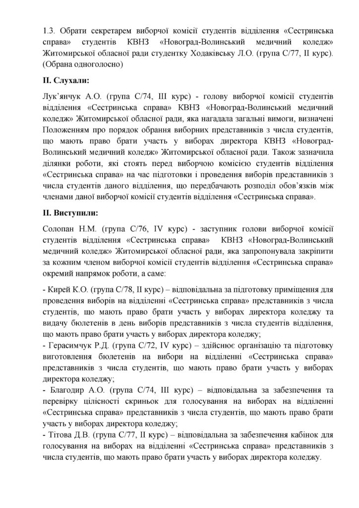 0 Протокол № 3 засідання виборчої комісії студентів відділення «Сестринська справа» КВНЗ «Новоград-Волинський медичний коледж» Житомирської обласної ради 28.03.2018