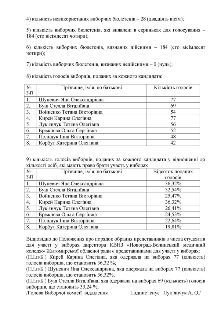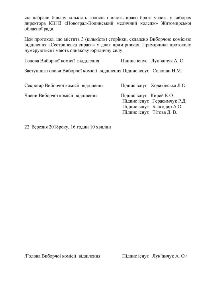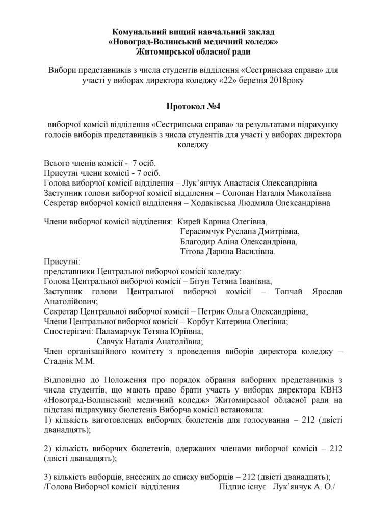 Протокол виборчої комісії відділення «Сестринська справа» за результатами підрахунку голосів виборів представників з числа студентів для участі у виборах директора коледжу