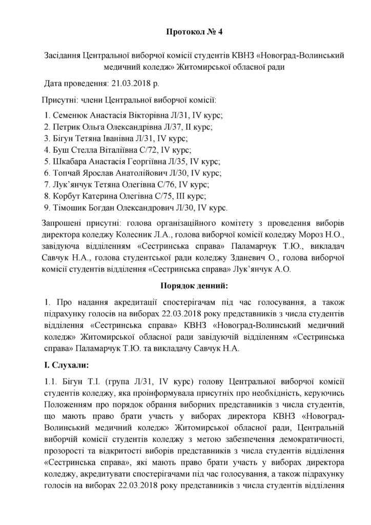 Протокол № 4 Засідання Центральної виборчої комісії студентів КВНЗ «Новоград-Волинський медичний коледж» 27.03.2018 Якщо ви знайшли помилку, будь ласка, виділіть фрагмент тексту та натисніть Ctrl+Enter. Share