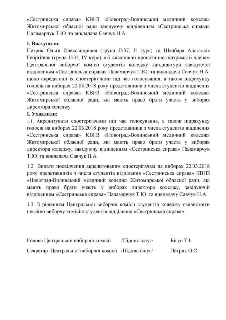 0 Протокол № 5 засідання Центральної виборчої комісії студентів КВНЗ «Новоград-Волинський медичний коледж» 27.03.2018