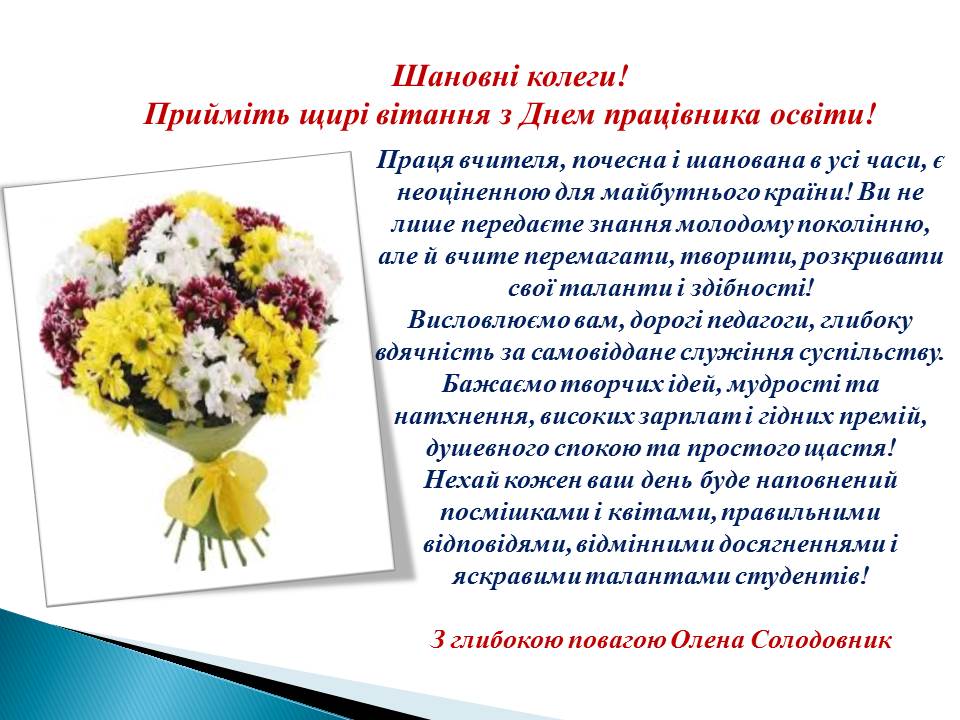 Прийміть щирі вітання з Днем працівника освіти! 05.10.2018 Якщо ви знайшли помилку, будь ласка, виділіть фрагмент тексту та натисніть Ctrl+Enter. Share