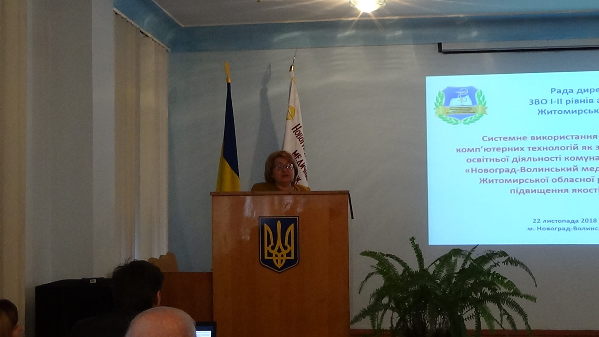 Директор Новоград-Волинського медичного коледжу Солодовник Олена Володимирівна представила колегам досвід роботи свого колективу з використання інформаційно-комунікаційних технологій, створення єдиного інформаційного середовища в закладі, що вирівнює можливості в отриманні однакового доступу до освітньої послуги, забезпечує ефективну комунікацію між усіма структурами коледжу, підвищує якість, швидкість і точність діяльності та полегшує взаємодію між усіма учасниками освітнього процесу. Керівник коледжу акцентувала увагу на актуальності запровадження внутрішньої інформаційної мережі, значних перевагах функціонування програми «lCloud», особливо у напрямку підвищення якості освіти та повідомила, що вищезазначена програма отримала схвалення МОН та рекомендована до використання в закладах освіти.