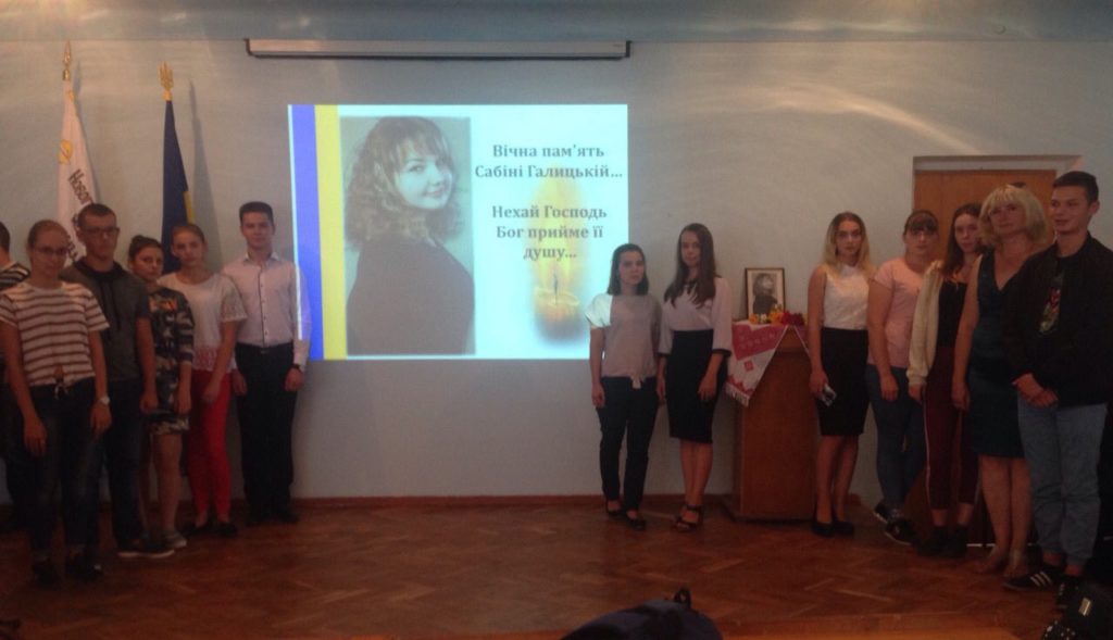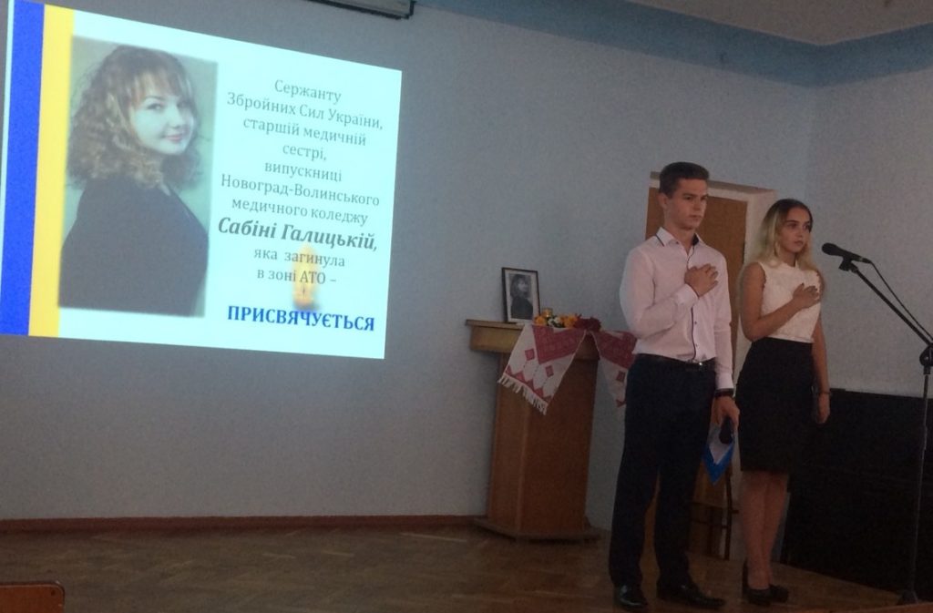 У війни не жіноче обличчя, але війна не обирає своїх жертв та героїв. Багатьом із них, на жаль, не судилося повернутися живими. Саме тому 20 вересня, у медичному коледжі студенти груп Л39/ІІІ, Л40/ІІ провели для першокурсників виховний захід, присвячений вшануванню пам’яті випускниці Новоград-Волинського медичного коледжу 2014 року, сержанта, старшої медичної сестри Збройних Сил України – Сабіні Галицькій, яка загинула в зоні АТО. Студенти другого та третього курсів розповіли першокурсникам про шкільні та студентські роки Сабіни і, про те, якою вона була, про спогади одногрупників і всіх тих, хто її знав.