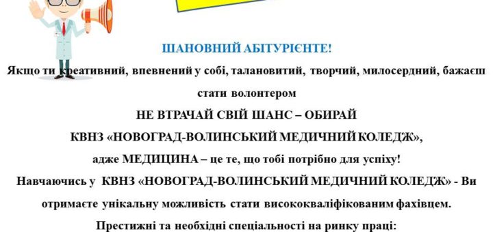Студенти КВНЗ «Новоград-Волинський медичний коледж», поєднуючи навчання з доброчинністю, організували благодійну акцію «Промені добра та милосердя» на підтримку тяжкохворого студента Чортківського медичного коледжу Андрія Славинського. На засіданні студентської ради було одностайно вирішено...