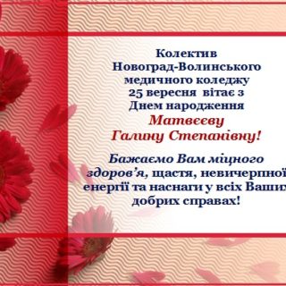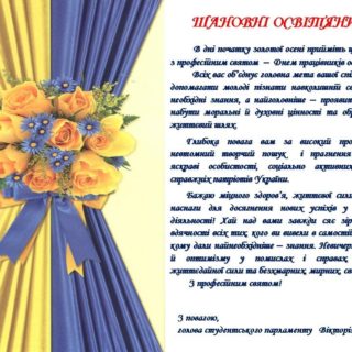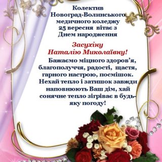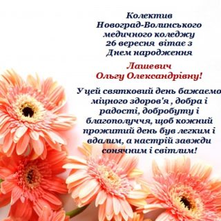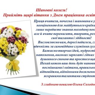 Вельмишановна Олено Володимирівно! Прийміть найщиріші привітання з нагоди Вашого Дня народження! Бажаємо Вам міцного здоров’я, душевної рівноваги, реалізації амбітних планів, невичерпного оптимізму, прихильності фортуни та унікальних можливостей. Нехай сонце яскраво освітлює Ваш шлях, а...