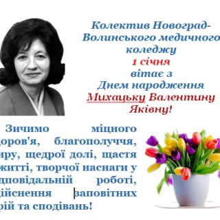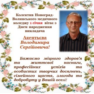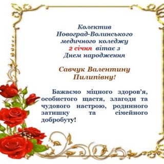 Колектив Новоград-Волинського медичного коледжу 6 січня вітає з Днем народження викладача Скаковського Віталія Євгенійовича! Бажаємо міцного здоров’я, удачі, благополуччя, добра, радості, любові, щастя, гарного настрою, посмішок, яскравих вражень. Нехай тепло і затишок...
