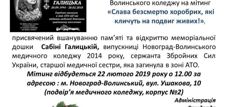 З ініціативи педагогічного колективу Новоград-Волинського медичного коледжу 22 лютого 2019 року о 12 годині відбувся мітинг та урочисте відкриття меморіальної дошки Сабіні Станіславівні Галицькій, випускниці коледжу 2014 року, сержанта, старшої медичної сестри Збройних Сил України, яка...
