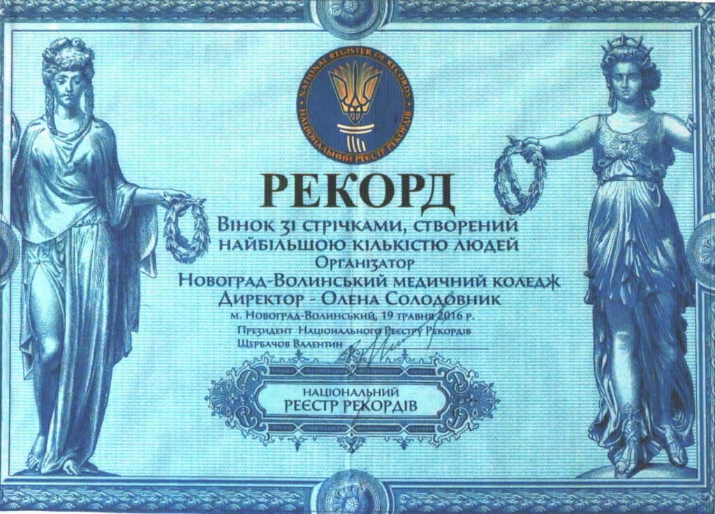 Значним досягненням Новоград-Волинського медичного фахового коледжу стало встановлення викладачами та студентами Національного Рекорду України «Вінок зі стрічками, створений найбільшою кількістю людей» (701 особа), що символізувало єдність у прагненні до щасливої квітучої європейської держави.