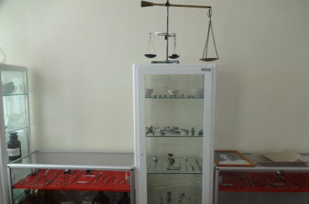 Поряд зі стендами на вітражах та в шафах розміщено експонати – медичні інструменти різних часів, медичний інвентар:  маніпуляційні столики, стоматологічна